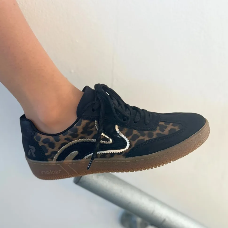 Rieker sneakers til dame i leopard. Trendy sneakers med leopardmønster og stilfulde sorte detaljer, der skaber et moderne look. Skoen har snørebånd, så du nemt kan justere pasformen til din fod. Indvendigt sikrer den bløde Rieker Soft indersål maksimal komfort, og den kan tages ud efter behov. Den lette og fleksible konstruktion kombineret med en stødabsorberende sål giver en behagelig oplevelse hele dagen.