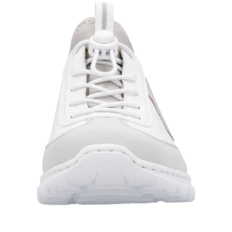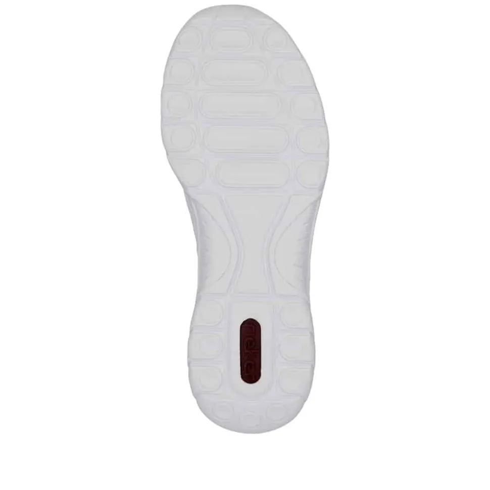 Rieker sneakers til dame i hvid. Denne lette og fleksible sneakers i en moderne hvid farve er fyldt med stilfulde detaljer, der giver et ekstra pift. Elastikken foran gør det nemt at tage skoene på, og den kan justeres, så pasformen passer perfekt til dine behov. Indvendigt finder du en blød memosoft-sål, der giver støtte og komfort hele dagen. Ydersålen er designet med stødabsorberende egenskaber og har et godt mønster, der øger skridsikkerheden.