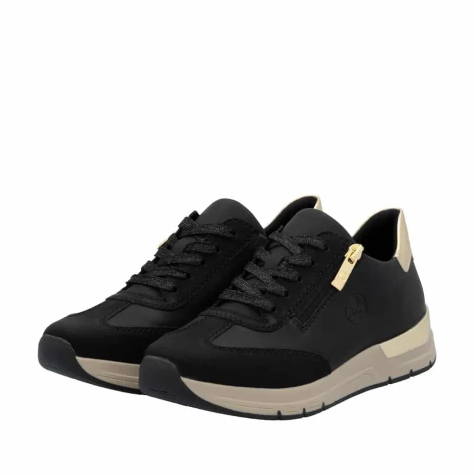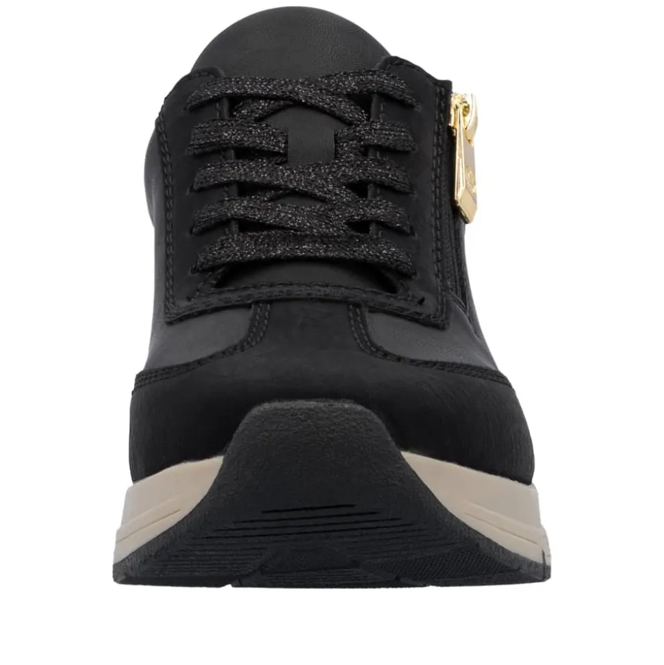 Rieker sneakers til dame i sort. Moderne sneakers i sort med flotte gulddetaljer og snørebånd med glimmer, der giver et feminint og stilfuldt udtryk. Skoen har både snørebånd og en praktisk lynlås i siden, så den er nem at tage af og på. Indvendigt bliver du mødt af en blød og udtagelig Rieker-soft sål, som giver god komfort dagen lang. Den lette og fleksible ydersål med stødabsorbering sikrer støtte og behagelig gang.