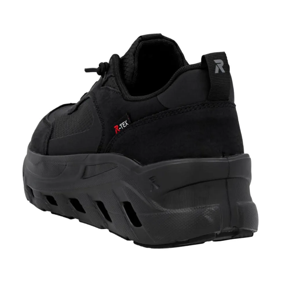Rieker sneakers til dame i sort. Disse smarte sneakers i klassisk sort kombinerer et sporty look med høj komfort. Foran er de udstyret med elastik, der gør dem nemme at tage af og på. Indvendigt finder du en blød udtagelig indersål, mens den ekstra bredde (G) giver god plads og fleksibilitet til foden. Skoen har Rieker-Tex der gør skoen kraftig vandafvisende og den mønstrede ydersål giver både øget stødabsorbering og skridsikkerhed.