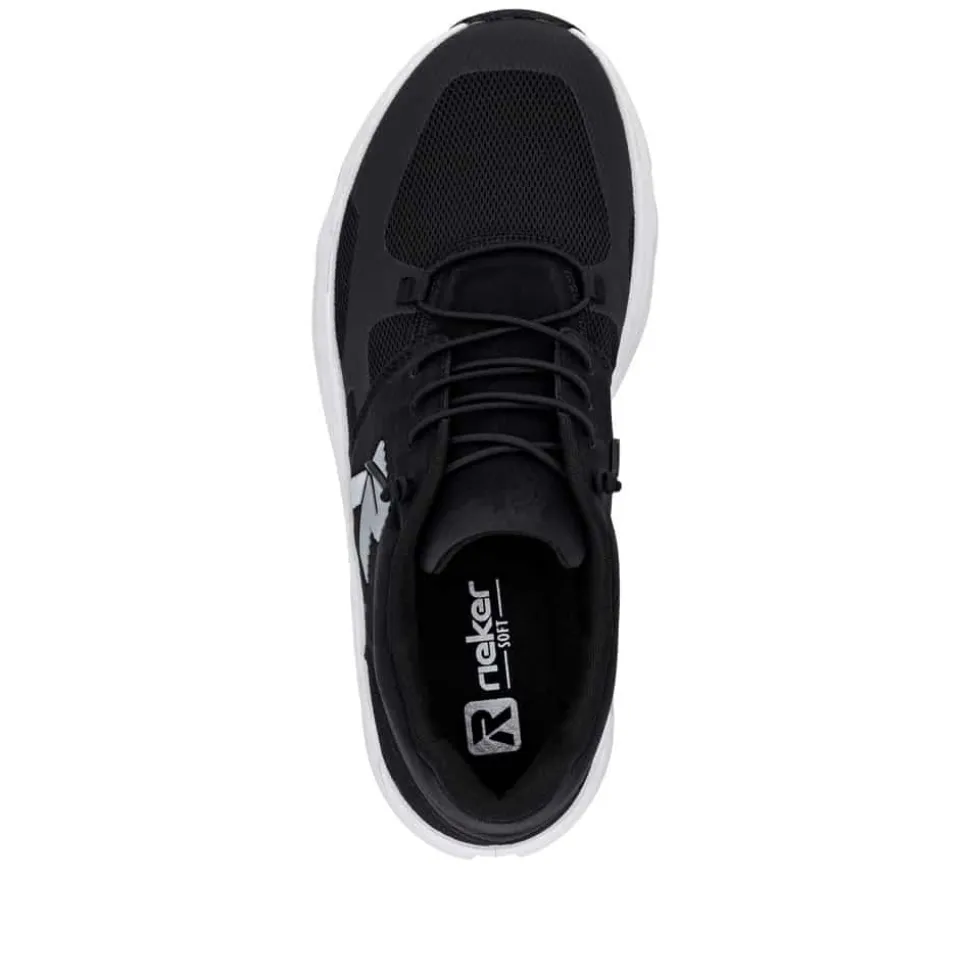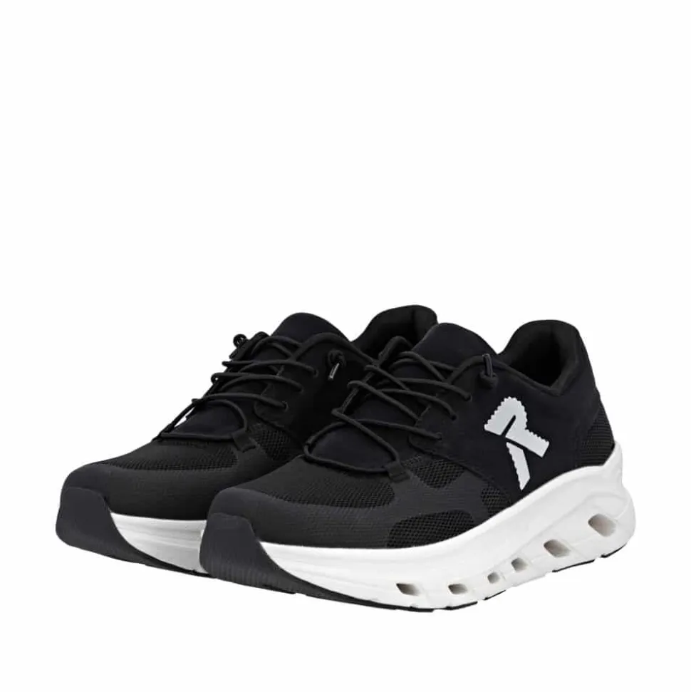 Rieker sneakers til herre i sort. Disse sorte sneakers kombinerer smart design med praktisk funktion. Skoen har elastik over vristen og leveres med snørebånd, så du selv kan vælge, hvad der passer bedst. Indvendigt finder du en blød og udtagelig Rieker-Soft indersål, der sikrer komfort hele dagen. Modellen har ekstra bredde (H), som giver god plads og fleksibilitet, mens den mønstrede ydersål bidrager med både øget stødabsorbering og skridsikkerhed.