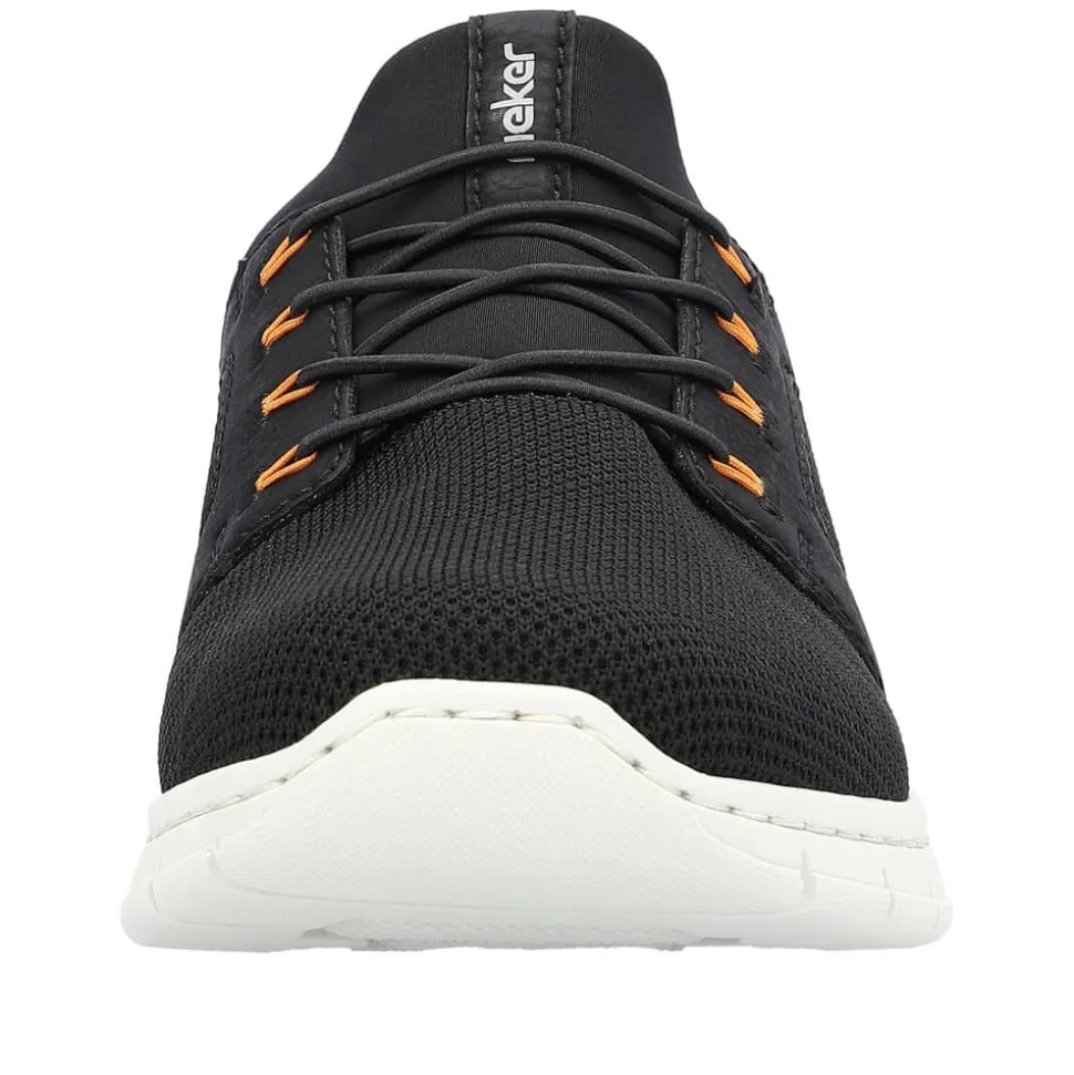 Rieker sneakers til herre i sort. Disse sorte Rieker sneakers til herrer er designet med elastiksnøre over vristen, hvilket gør dem både praktiske og moderne. Som en letvægtssneakers fra Rieker føles de så lette, at du næsten ikke bemærker, du har dem på. Modellen er udstyret med en brun hælkappe og en grå sål, der ikke kun er let og komfortabel, men også har stødabsorberende egenskaber, som giver optimal komfort dagen igennem. De orange detaljer langs elastikbåndene tilføjer et stilfuldt og sporty præg, der gør disse sneakers til et perfekt valg for den stilbevidste mand.