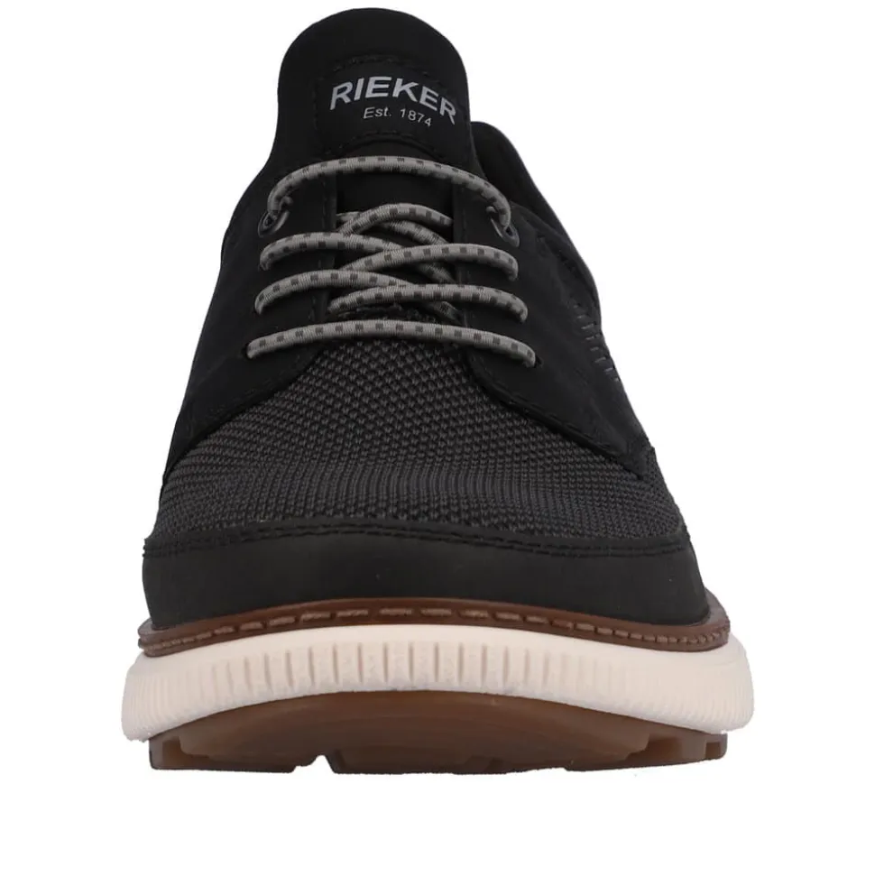 Rieker sneakers til herre i sort. Disse sorte Rieker sneakers til mænd kombinerer ikke kun stil med elegance, men sikrer også en enestående komfort i dagligdagen takket være deres høje kvalitet. Den praktiske elastiske snøring gør det nemt at tage skoene af og på uden besvær. Den lette og skridsikre sål gør hvert skridt til en sikker fornøjelse. Disse sneakers får ekstra pluspoint med en polstret og aftagelig indlægssål. Skoen er designet med ekstra bredde (H), der giver tilstrækkelig plads til foden, og de stødabsorberende såler aflaster hvert enkelt skridt.