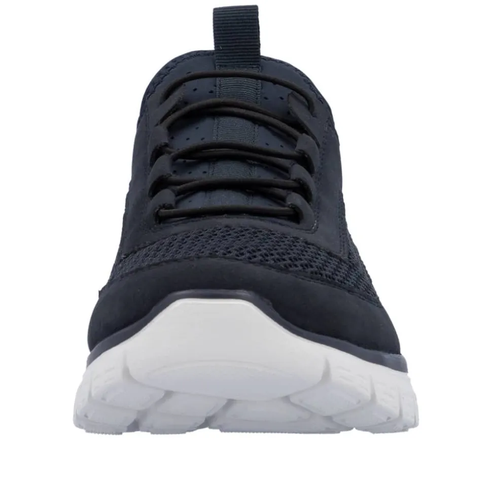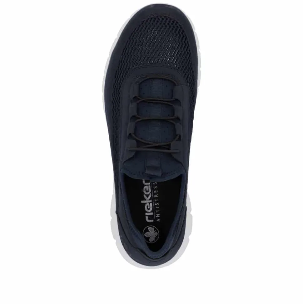 Rieker sneakers til herre i blå. Rieker har designet denne herre sneakers med fokus på funktionalitet og komfort. Skoen er nem at tage på takket være elastikken i åbningen og det smarte elastikbånd, som erstatter traditionelle snørebånd. Overdelen i åndbart mesh holder dine fødder friske, og den lette sål med Riekers velkendte stødabsorbering sørger for optimal komfort hele dagen.