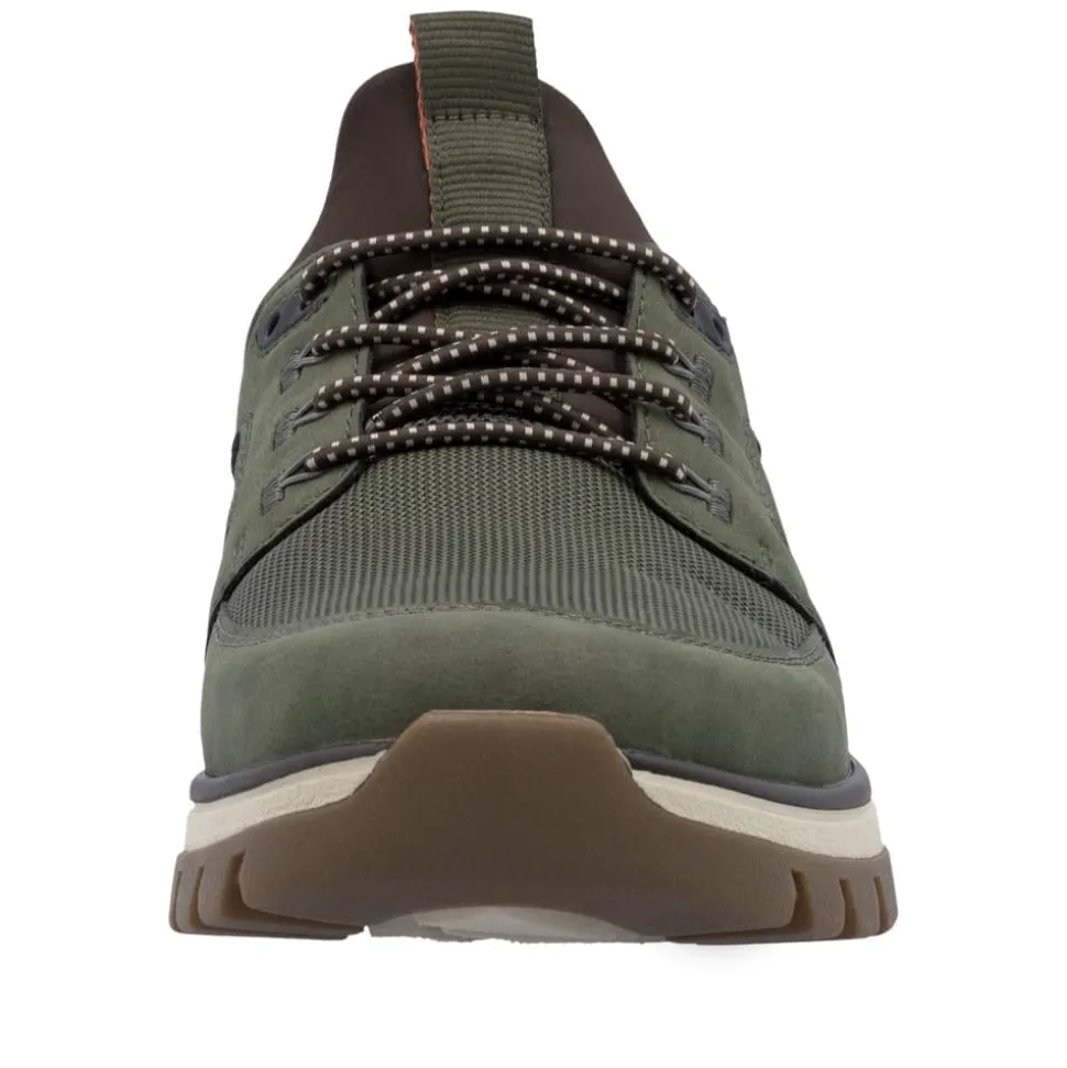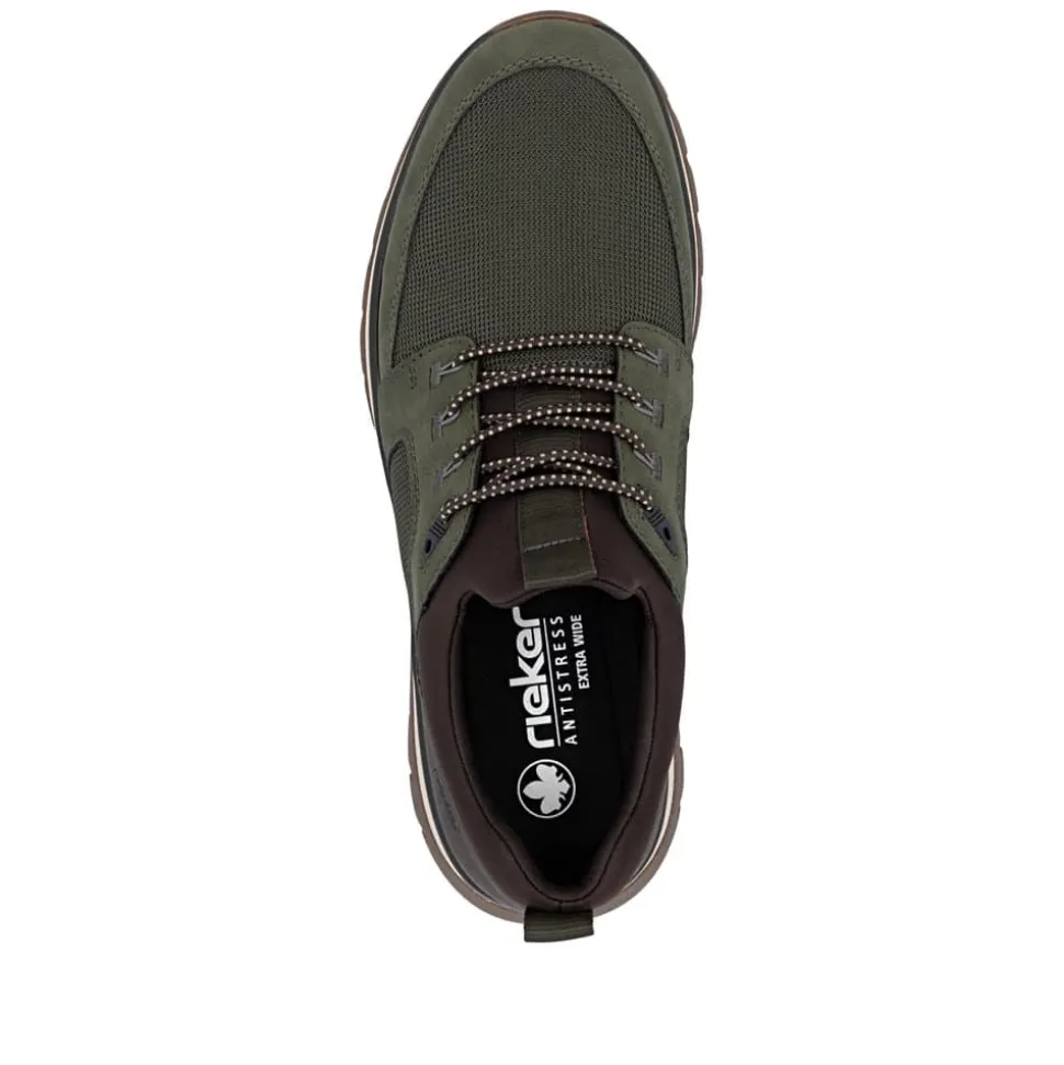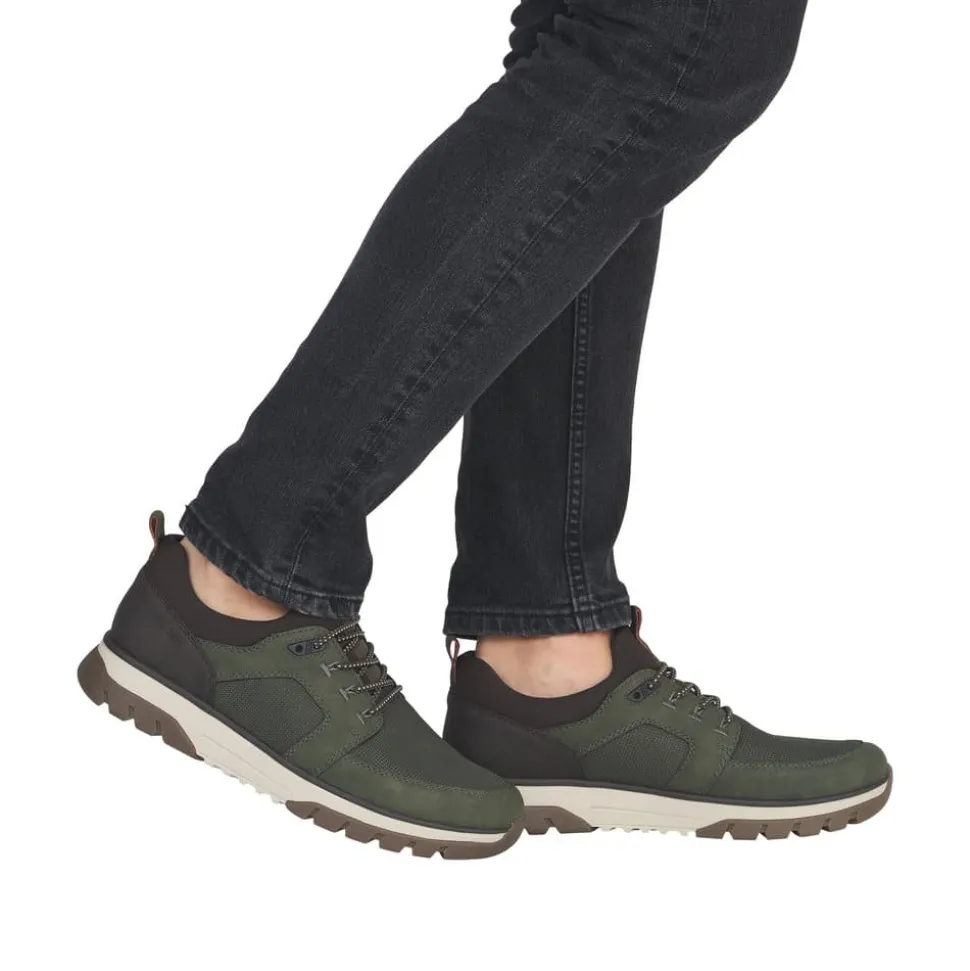 Rieker sneakers til herre i grøn. En smart sneakers med brune detaljer og elastisk, som gør den nem at få af og på. Indvendigt bliver du mødt af en blød udtagelig indersål, der giver god komfort gennem hele dagen. Skoen har ekstra bredde (H) for en mere rummelig pasform, mens den stødabsorberende gummisål med mønster giver øget støtte og skridsikkerhed.