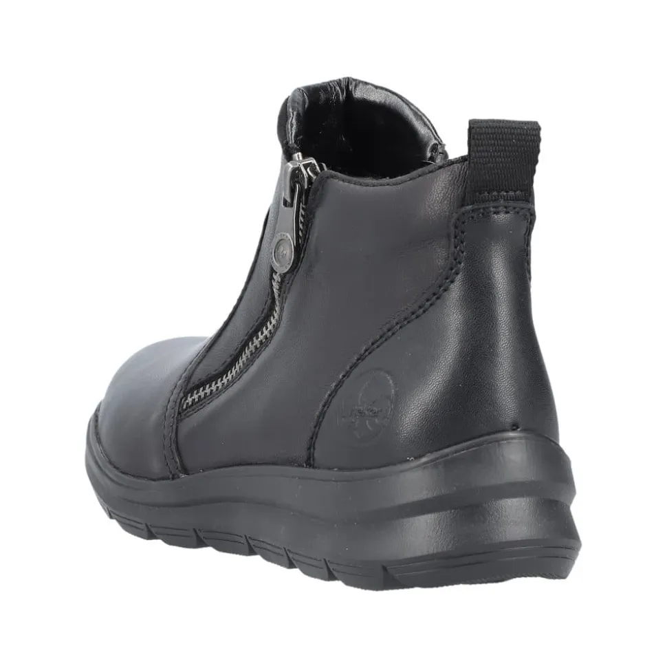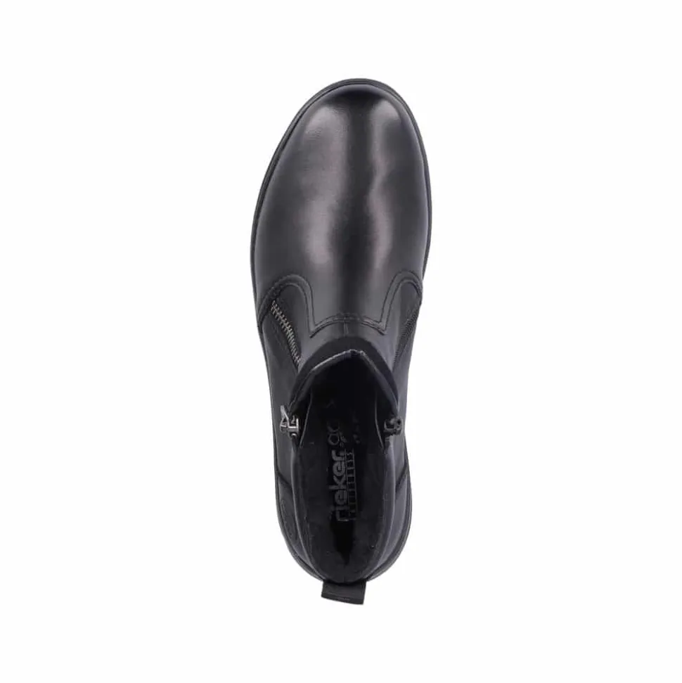Rieker støvle til dame i sort. Moderne støvle i sort med en overdel i skind og et klassisk design, der giver et stilfuldt udtryk. Støvlen har to funktionelle lynlåse, som gør den nem at tage af og på. Indvendigt finder du en blød og udtagelig indersål, mens den varme foring sørger for, at dine fødder holdes lune. Den stødabsorberende ydersål med et godt mønster giver øget støtte og skridsikkerhed.