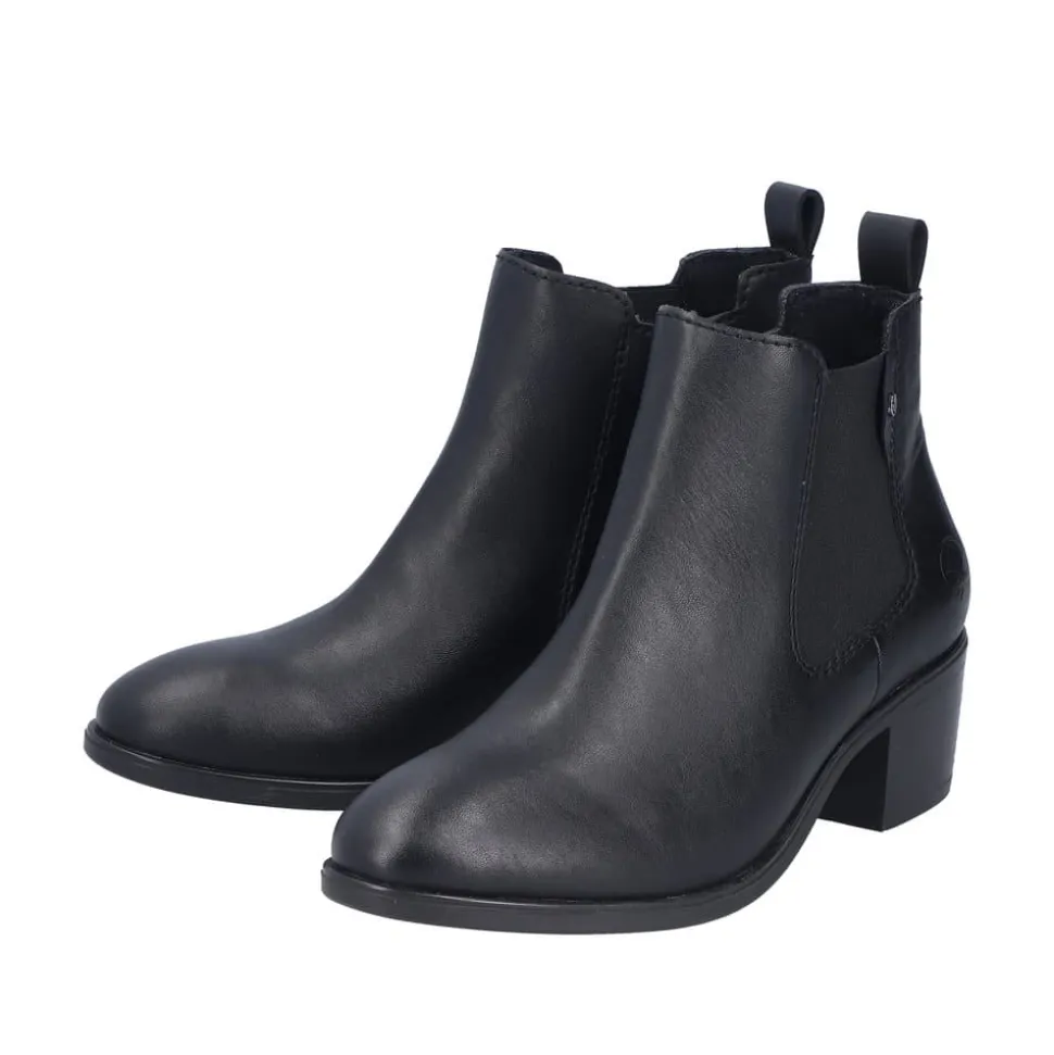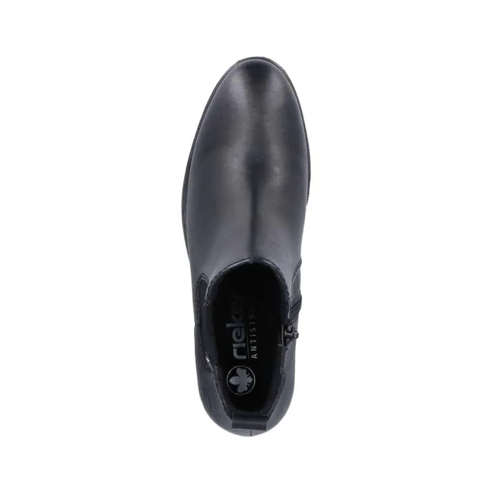 Rieker støvle til dame i sort. Flot klassisk støvle, der er perfekt til finere brug. Modellen har en funktionel lynlås på indersiden og en elastik på ydersiden, som gør den let at tage af og på. Indvendigt sørger en blød sål og en let foring for behagelig komfort hele dagen. Støvlen er designet med en blokhæl på 5 cm, der giver et elegant løft uden at gå på kompromis med komforten. Den mønstrede ydersål giver både øget stødabsorbering og skridsikkerhed.