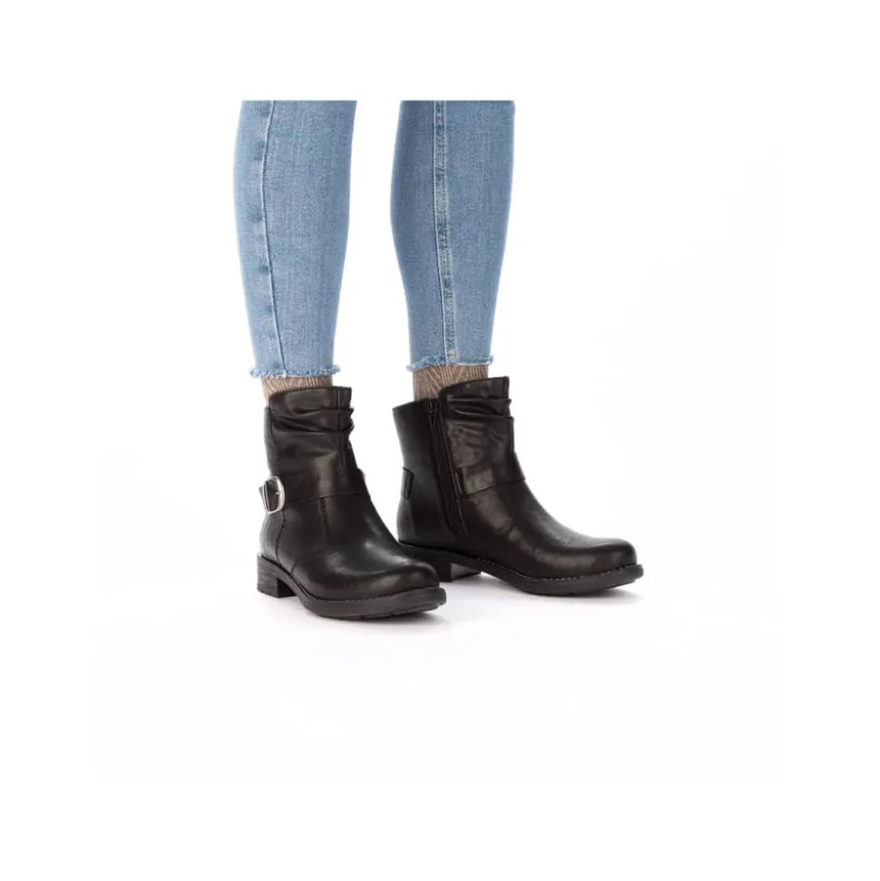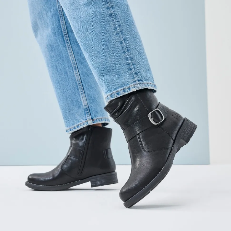 Rieker støvle til dame i sort. Denne sorte støvle kombinerer et klassisk design med moderne detaljer. Den smukke spænde på siden giver et stilfuldt udtryk, og lynlåsen på indersiden gør det enkelt at tage støvlen af og på. Indvendigt er den udstyret med en let foring og en blød, udtagelig indersål, som sikrer behagelig komfort dagen igennem. Med en blokhæl på ca. 3,5 cm får du et flot løft, mens ydersålen med stødabsorbering og mønster giver stabilitet og øget skridsikkerhed.
