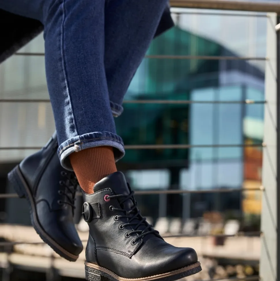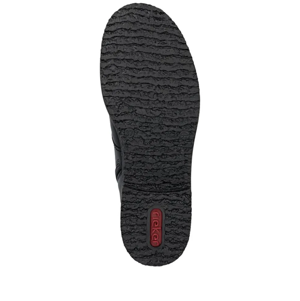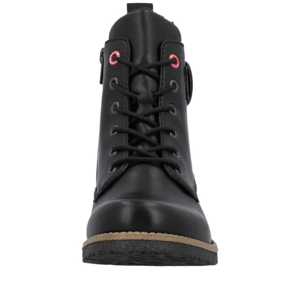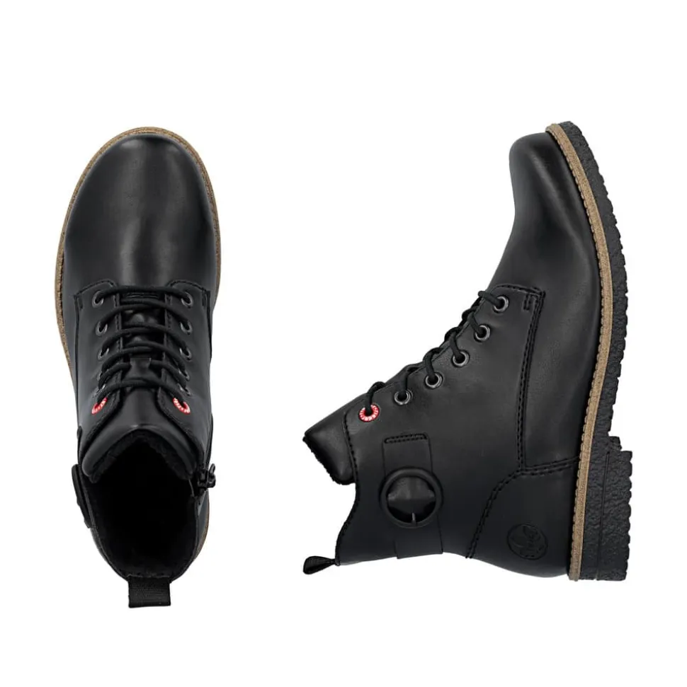 Rieker støvle til dame i sort. Flotte sorte støvler med en enkel detalje, der giver et tidløst og stilrent udtryk. Modellen har snørebånd og en praktisk lynlås, som gør det nemt at tage støvlen af og på. Indvendigt er den udstyret med en let foring og en blød indersål, der giver komfort hele dagen. Hælen på 2,5 cm giver et elegant løft. Rieker Antistress teknologien gør støvlen let og fleksibel, mens ydersålen med mønster giver øget stødabsorbering og skridsikkerhed.