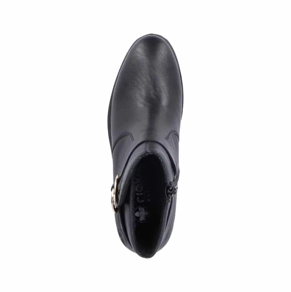Rieker støvle til dame i sort. Oplev en elegant ankelstøvle, der kombinerer stil og komfort til perfektion. Modellen har en sort overdel med dekorative syninger og et smukt spænde omkring anklen, som tilføjer et stilfuldt udtryk. Indvendigt sikrer en blød indersål og en let foring, at støvlen føles behagelig hele dagen. Med Rieker Antistress er den både let, fleksibel og udstyret med effektiv stødabsorbering, så hvert skridt føles ekstra behageligt. Den 5 cm høje blokhæl giver et elegant løft uden at gå på kompromis med komforten.