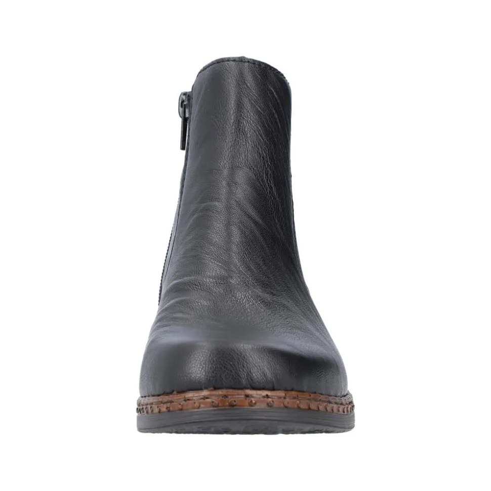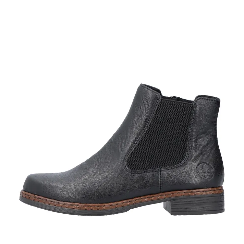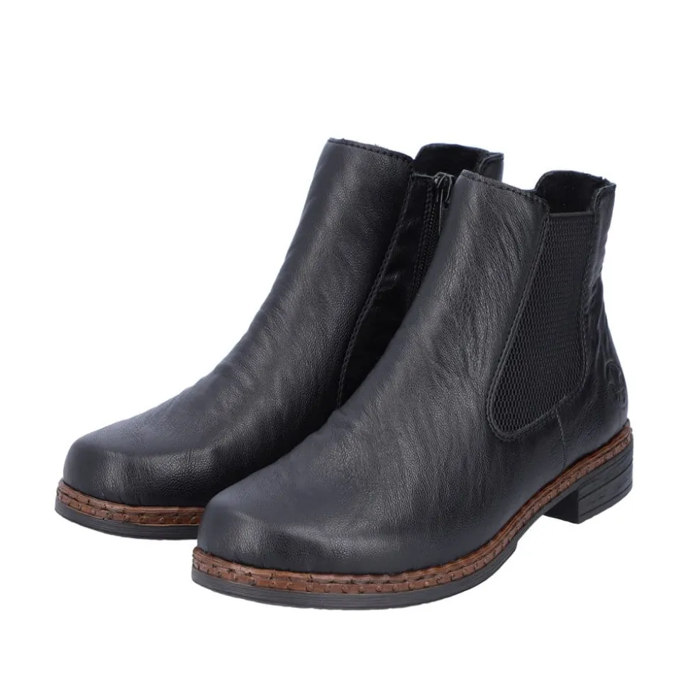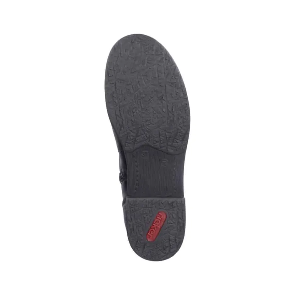 Rieker støvle til dame i sort. Klassisk støvle i en flot sort farve med enkle detaljer, der giver et moderne look. Støvlen har en elastik på ydersiden samt en funktionel lynlås på indersiden, der gør det let at komme i og af den. Indvendigt bliver du mødt af en blød indersål og en let foring, der holder dine fødder lune. Støvlen er designet med stødabsorberende egenskaber for øget komfort samt en lille hæl, der løfter dig elegant.