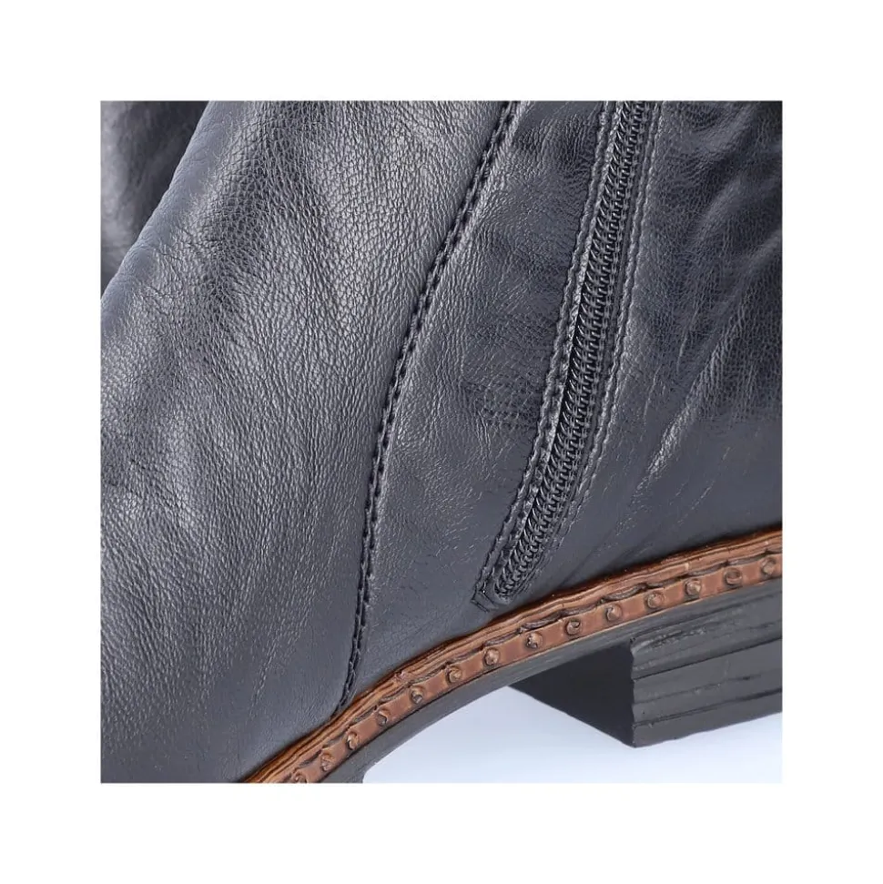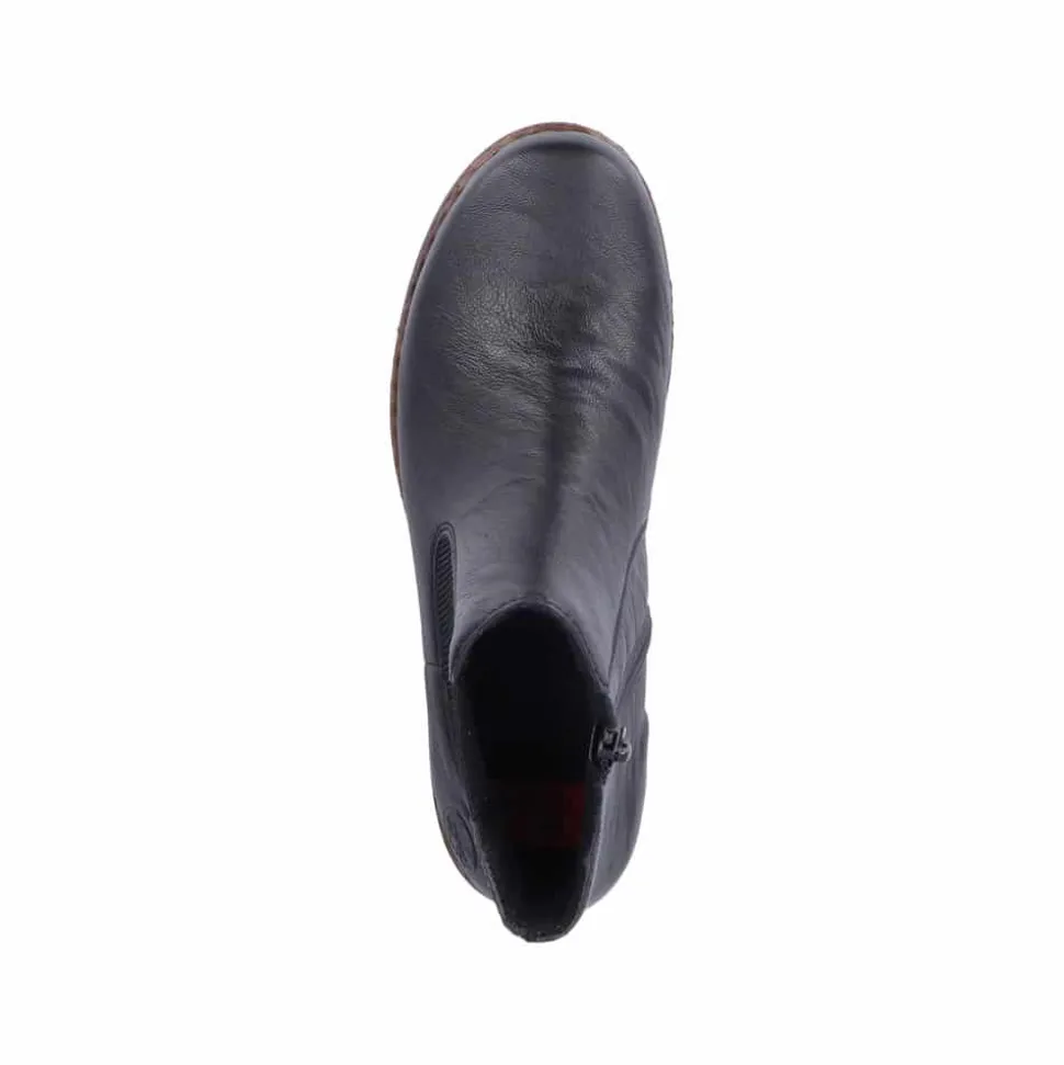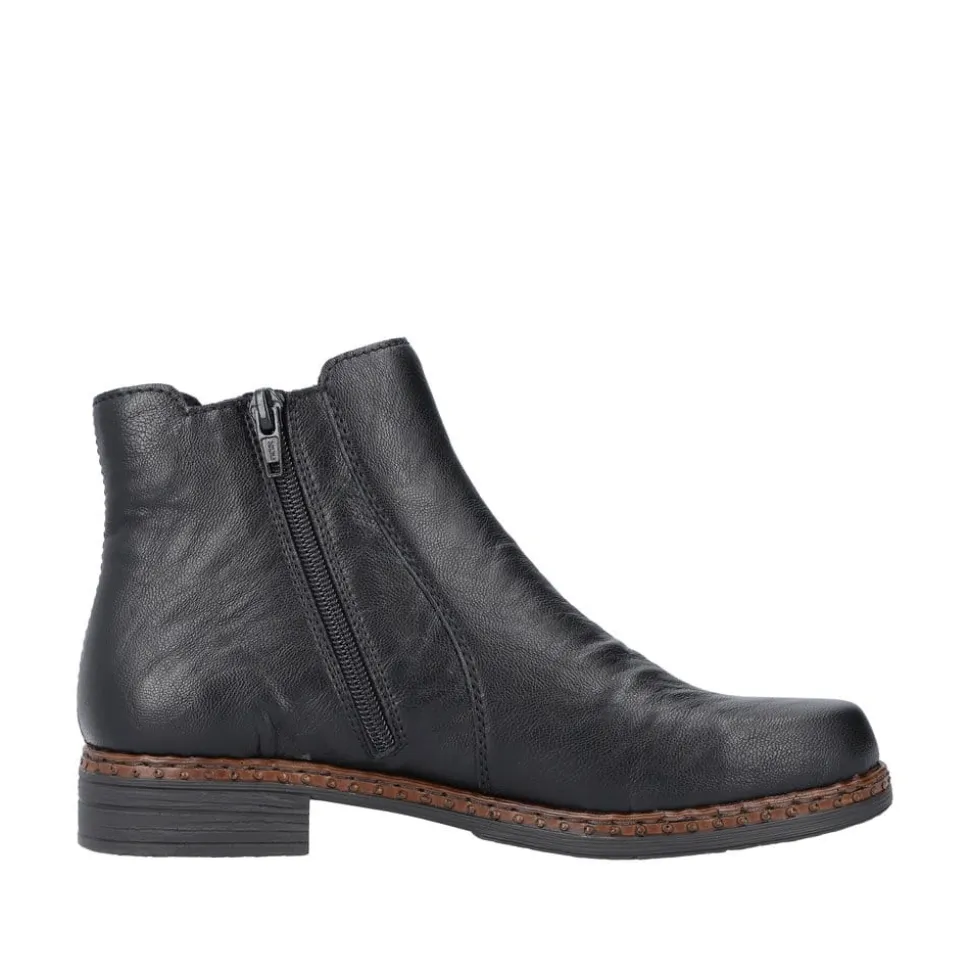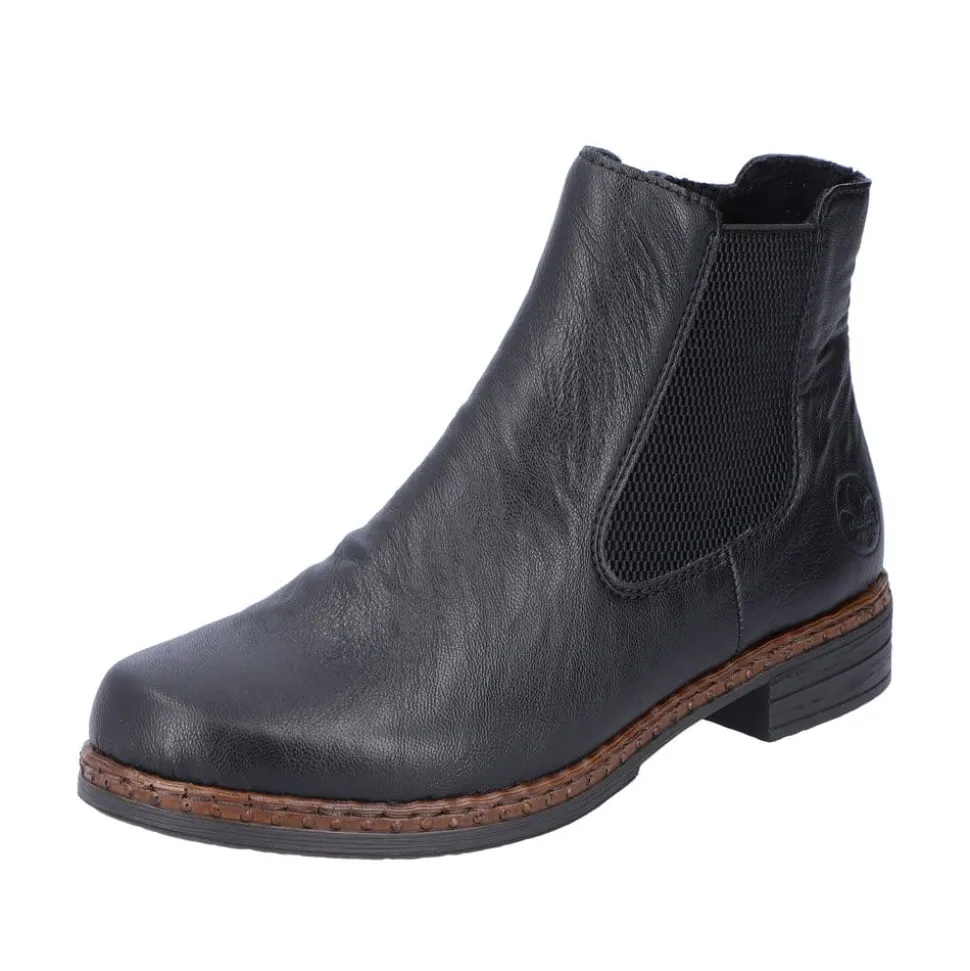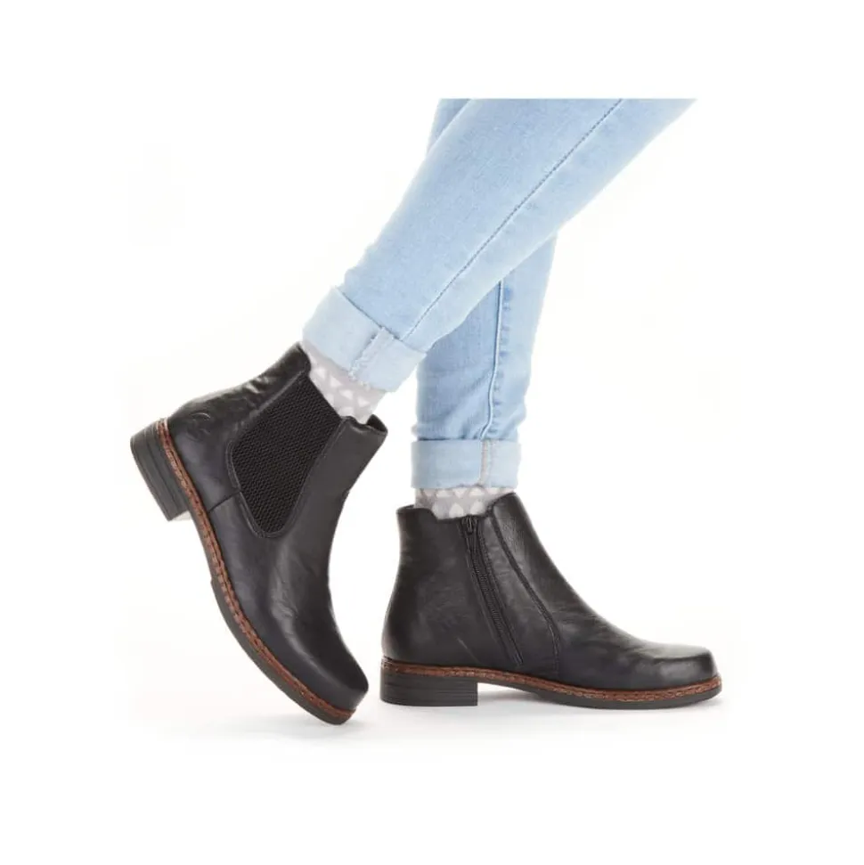 Rieker støvle til dame i sort. Klassisk støvle i en flot sort farve med enkle detaljer, der giver et moderne look. Støvlen har en elastik på ydersiden samt en funktionel lynlås på indersiden, der gør det let at komme i og af den. Indvendigt bliver du mødt af en blød indersål og en let foring, der holder dine fødder lune. Støvlen er designet med stødabsorberende egenskaber for øget komfort samt en lille hæl, der løfter dig elegant.