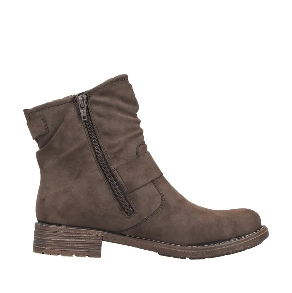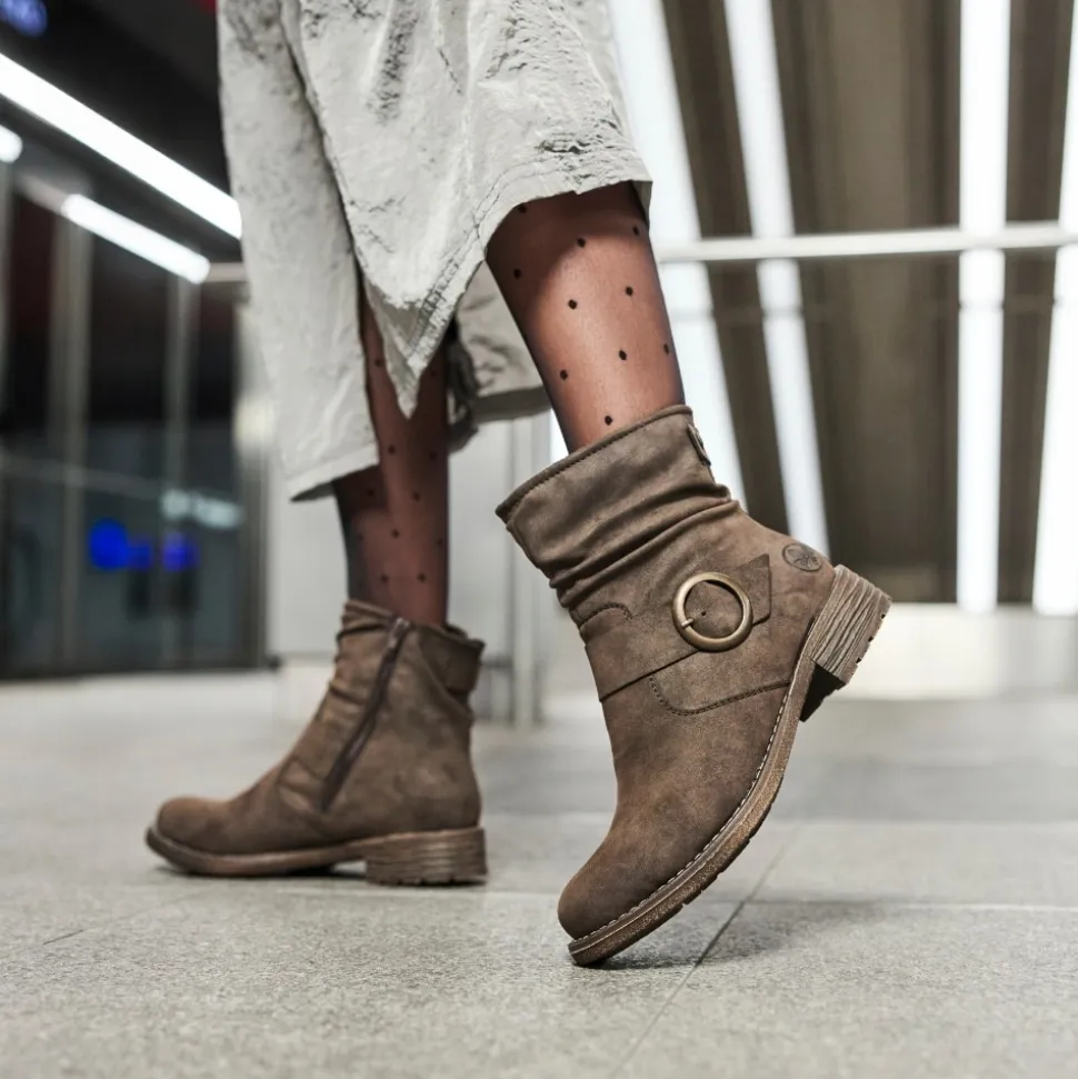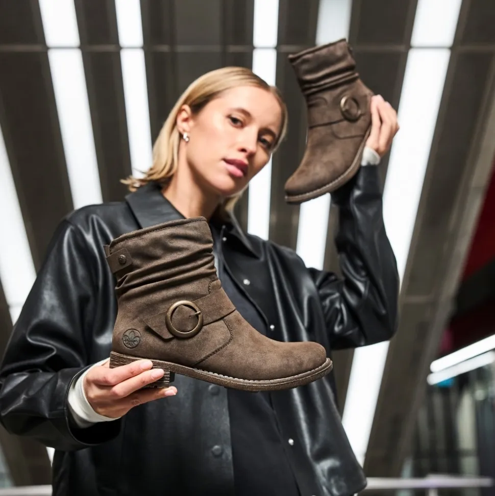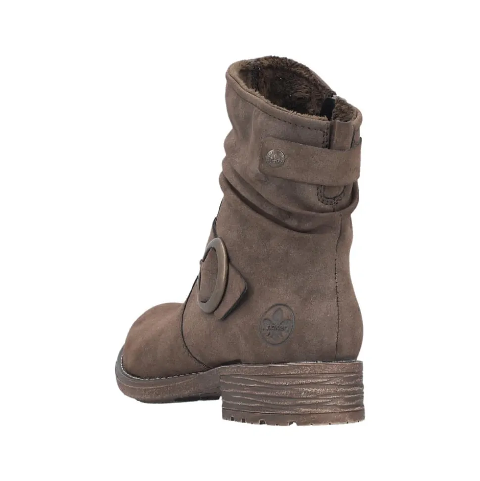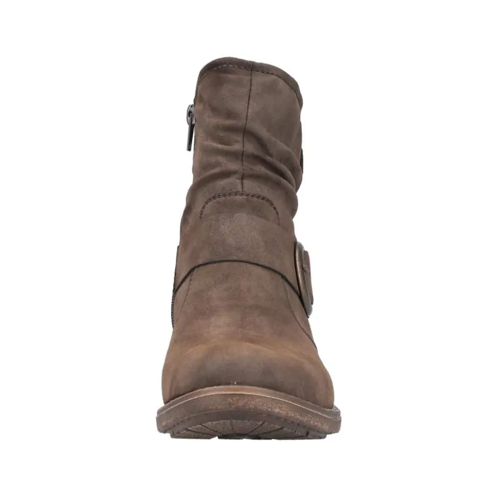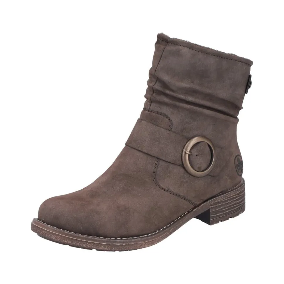 Rieker støvle til dame i mørkebrun. Moderne støvle i en smuk brun farve med en dekorativ spænde på siden, der tilfører et feminint og stilfuldt udtryk. Støvlen er udstyret med en funktionel lynlås på indersiden, så den er nem at tage af og på. Indvendigt finder du en let foring og en blød, udtagelig indersål, som giver høj komfort gennem hele dagen. Den lille blokhæl på ca. 3,5 cm giver et elegant løft, mens den stødabsorberende ydersål med mønster giver øget støtte og skridsikkerhed.
