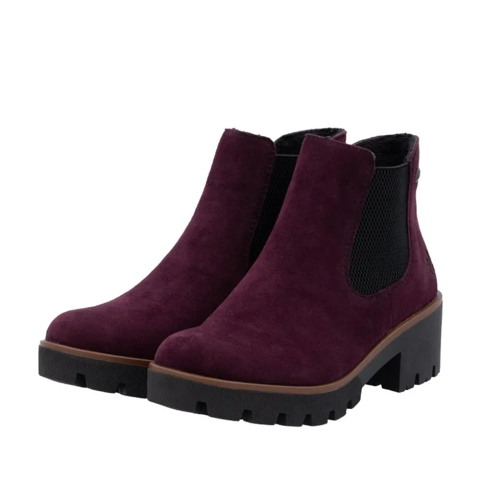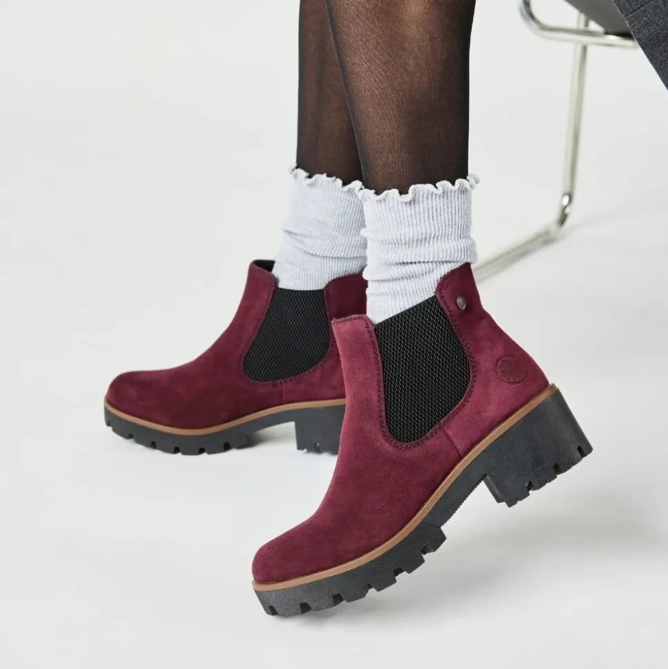 Rieker støvle til dame i bordeaux. Moderne chelseastøvle til dame i en smuk bordeaux farve med en elegant ruskindsoverdel, der tilfører et stilfuldt udtryk. Støvlen har elastik i begge sider, som sikrer en behagelig pasform og gør den nem at tage af og på. Indvendigt finder du en blød indersål og en let foring, der giver komfort hele dagen. Den solide blokhæl på 5 cm tilføjer et elegant løft, uden at gå på kompromis med komforten. Ydersålen har stødabsorberende egenskaber og et mønster, der giver øget støtte og skridsikkerhed.