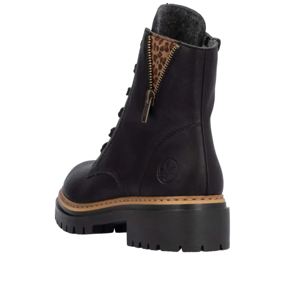 Rieker støvle til dame i sort. Moderne støvle i klassisk sort med flotte leoparddetaljer og pynte lynlås på siden, der giver et ekstra strejf af stil. Støvlen har snørebånd og en funktionel lynlås på indersiden, som gør det nemt at tage den af og på. Indvendigt finder du en let foring, der holder fødderne varme, og en blød indersål, som giver komfort hele dagen. Med en blokhæl på ca 4,5 cm bliver du løftet elegant uden at gå på kompromis med komforten. Ydersålen er mønstret og udstyret med stødabsorbering for øget støtte og skridsikkerhed.