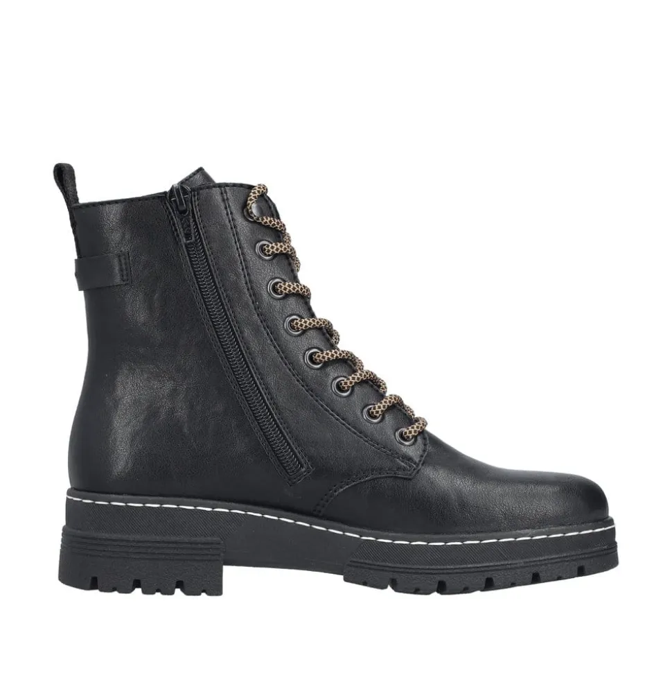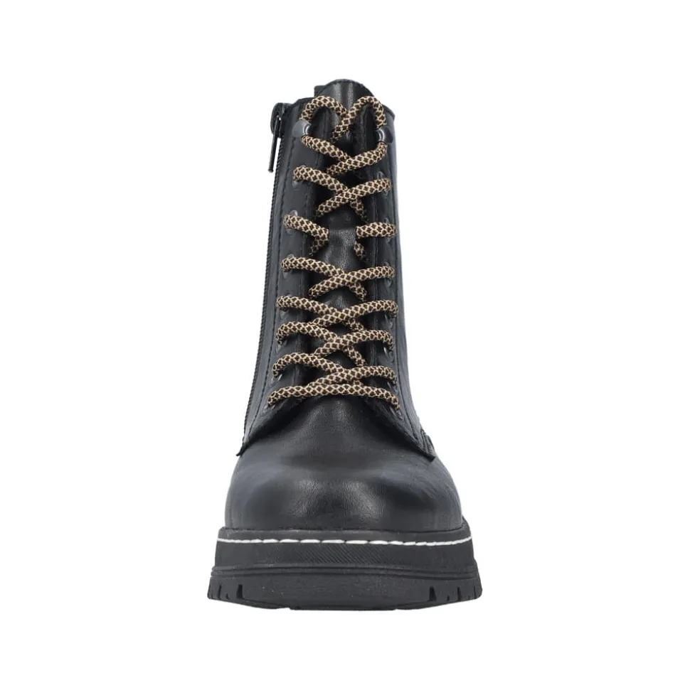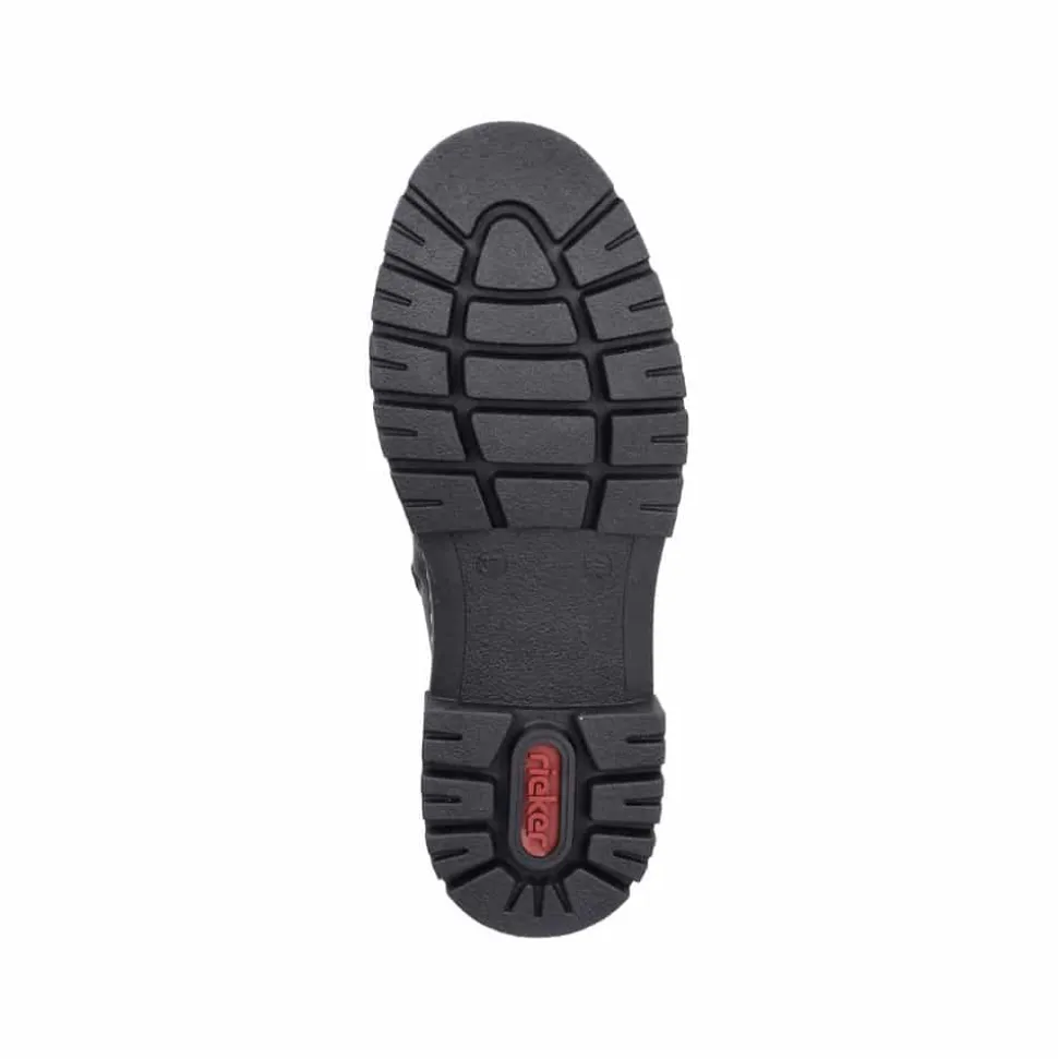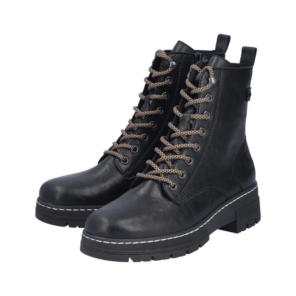 Rieker støvle til dame i sort. Denne smarte sorte støvle er et oplagt valg til hverdagen, hvor komfort og funktion er i fokus. Støvlen har snørebånd samt en funktionel lynlås, der gør det let at komme i og af støvlen og samtidig giver mulighed for at tilpasse pasformen. Indvendigt mødes du af en blød og udtagelig sål samt en let foring, som giver behagelig komfort hele dagen. Den chunky ydersål med en blokhæl på 2 cm giver et flot løft, mens mønsteret giver øget stødabsorbering og skridsikkerhed.