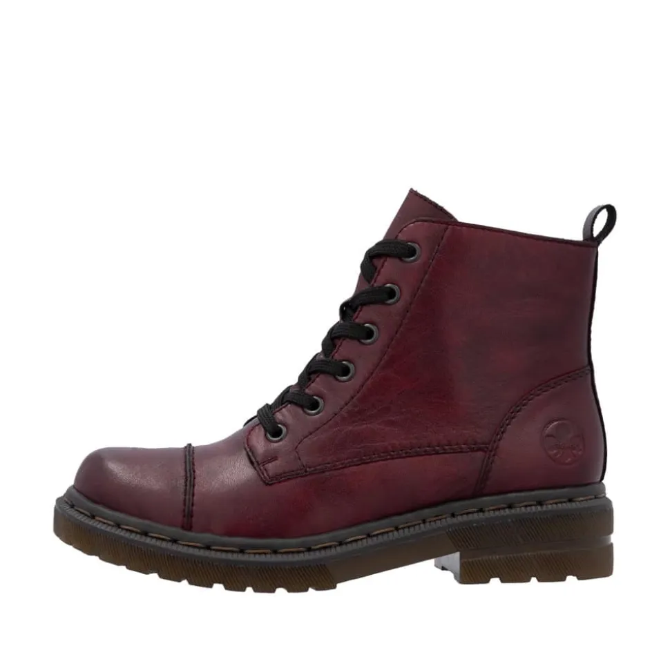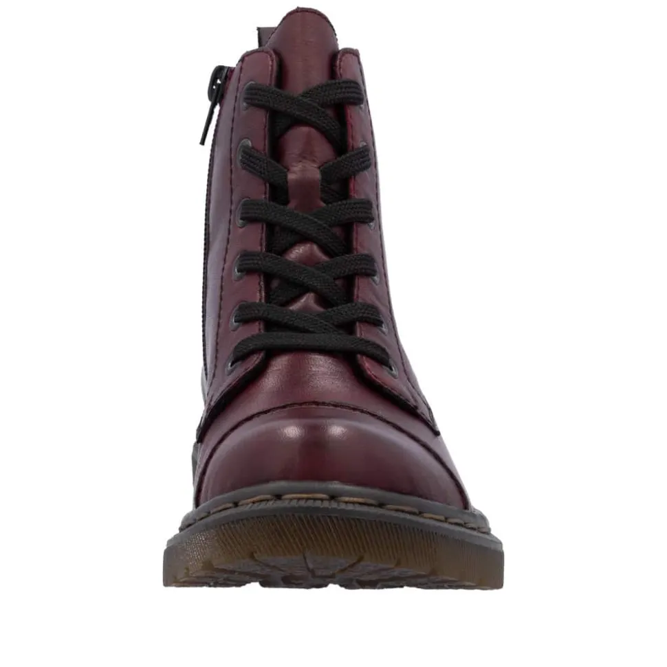 Rieker støvle til dame i bordeaux. En elegant støvle i moderne bordeaux med et enkelt, men stilfuldt look. Støvlen er fremstillet i blødt skind og udstyret med snørebånd foran samt en praktisk lynlås på indersiden, så pasformen kan tilpasses og den er nem at tage af og på. Indvendigt oplever du en behagelig kombination af en blød indersål og en let foring, der giver varme og komfort. Den fleksible ydersål er designet med stødabsorbering og et solidt mønster, som giver øget støtte og sikkerhed i hverdagen.
