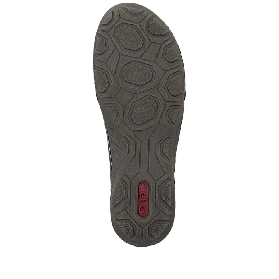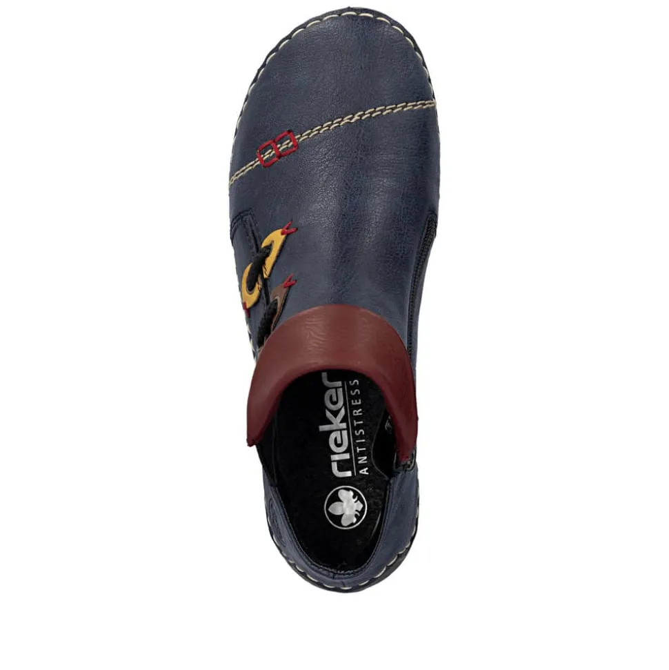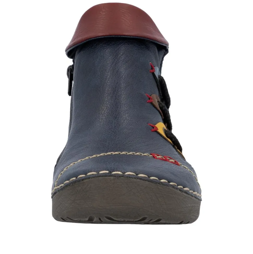 Rieker støvle til dame i blå. Denne model har en smart blå farve og praktiske detaljer, der gør den nem at bruge i hverdagen. Lynlåsen på indersiden og elastikken på ydersiden gør det hurtigt at komme i og af skoen. Indvendigt finder du en let foring og en blød Rieker-soft sål, som giver god komfort hele dagen. Ydersålen er mønstret og bidrager til både stødabsorbering og skridsikkerhed, så du står stabilt og går trygt.