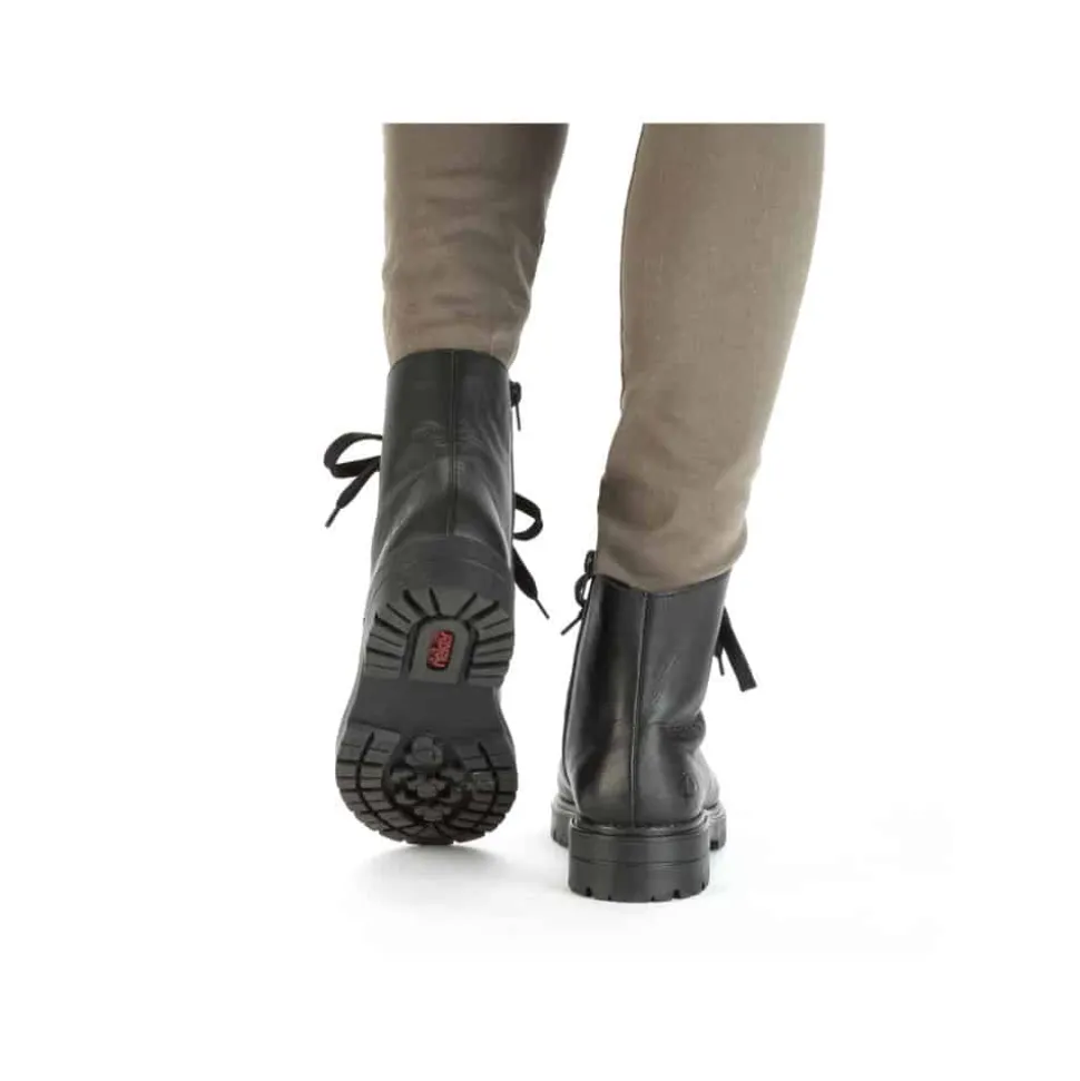 Rieker støvle til dame i sort. Denne sorte støvle i skind kombinerer moderne stil med praktiske detaljer. Støvlen har både snørebånd og en funktionel lynlås, der gør det nemt at tage den af og på, samtidig med at du kan tilpasse pasformen til din fod. Indvendigt sørger en let foring og en blød sål for behagelig komfort hele dagen. Ydersålen er mønstret og stødabsorberende, hvilket giver øget støtte og skridsikkerhed.