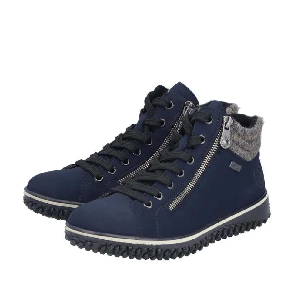 Rieker støvle til dame i blå. Denne støvle kombinerer stil og komfort, hvilket gør den perfekt til hverdagsbrug. Modellen er udstyret med både snørebånd og funktionelle lynlåse, så støvlen er nem at tage af og på. Indvendigt finder du en blød sål og en let foring, der giver høj komfort hele dagen. Takket være Rieker-Tex er støvlen kraftigt vandafvisende, mens den mønstrede ydersål giver øget stødabsorbering og skridsikkerhed.