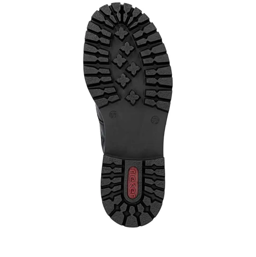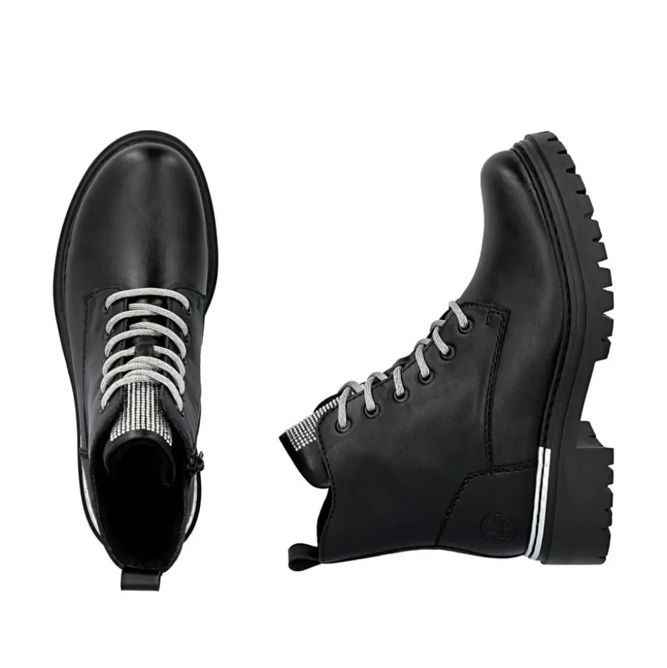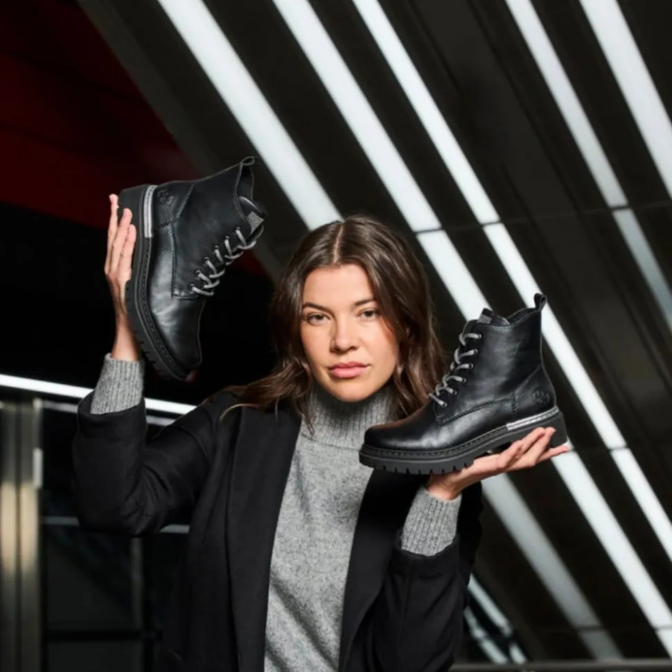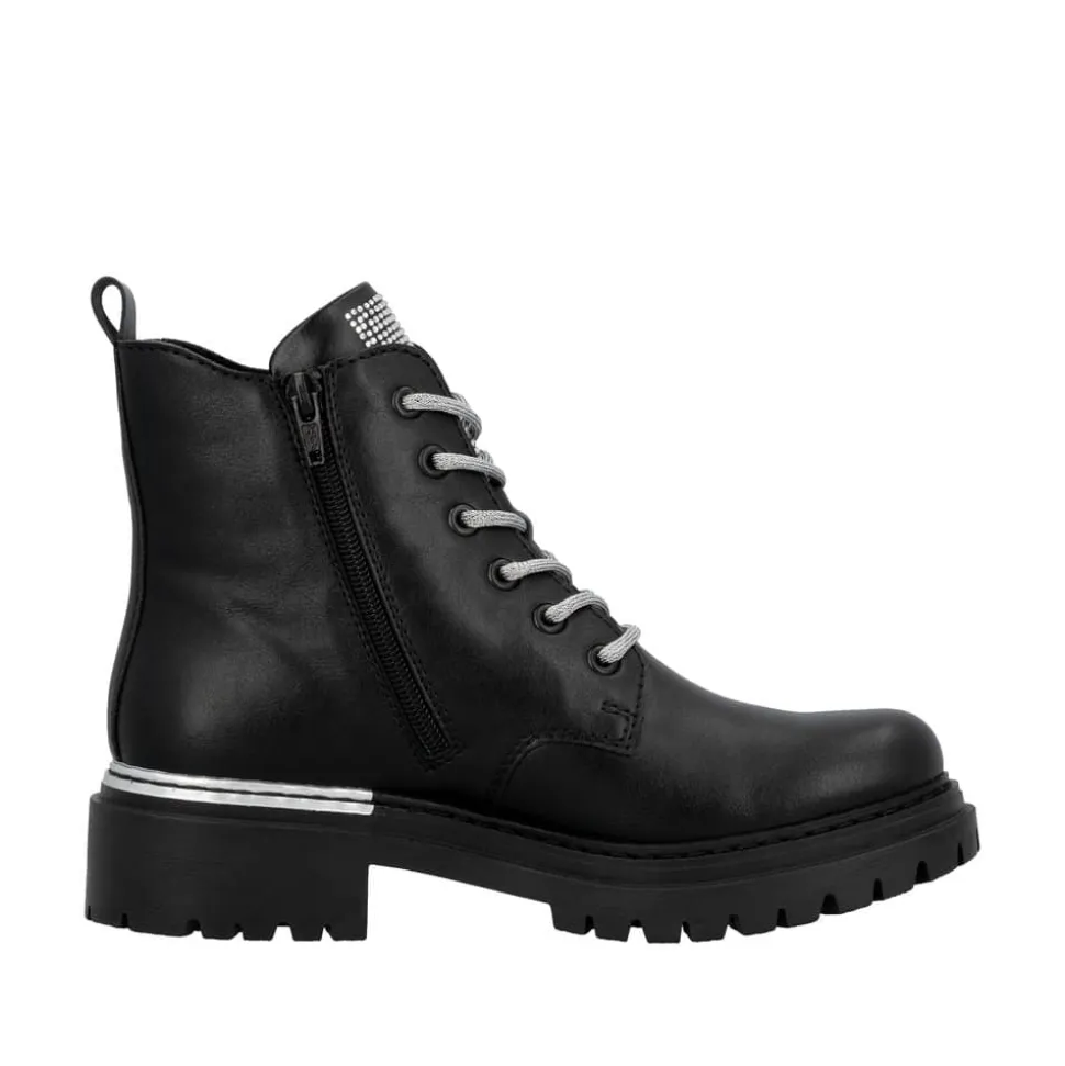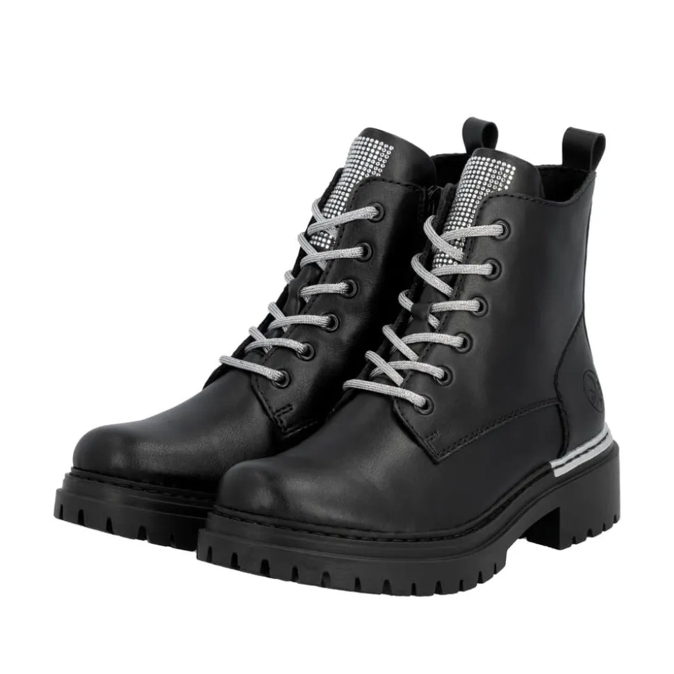 Rieker støvle til dame i sort. Stilfuld støvle til dame i en smuk sort farve med elegante sølvdetaljer, der giver et moderne udtryk. Støvlen er udstyret med snørebånd og en funktionel lynlås, som gør den nem at tage af og på, samtidig med at pasformen kan tilpasses perfekt. Indvendigt finder du en let foring og en blød indersål, der giver komfort hele dagen og holder dine fødder varme. Ydersålen på 5 cm. har stødabsorberende egenskaber og et mønster, der øger både støtte og skridsikkerhed.