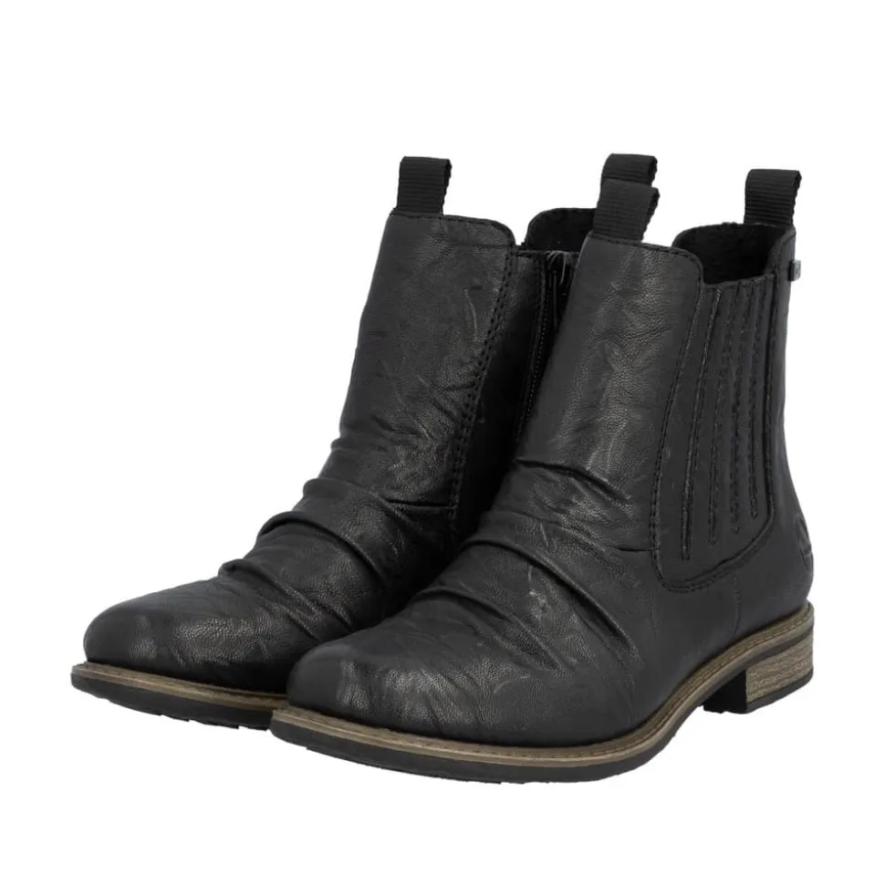 Rieker støvle til dame i sort. En stilfuld støvle i sort med rynkede detaljer, der giver et tidløst og feminint look. Overdelen er i skind, og støvlen har elastik på ydersiden og lynlås på indersiden, som gør den let at tage på og giver en god pasform. Indvendigt er der en let foring og en blød, udtagelig indersål med ekstra bredde H, som giver maksimal komfort og ekstra plads. Rieker Tex gør støvlen kraftigt vandafvisende, mens hælen på 2,5 cm tilfører et elegant løft. Den stødabsorberende ydersål med mønster giver øget støtte og skridsikkerhed.