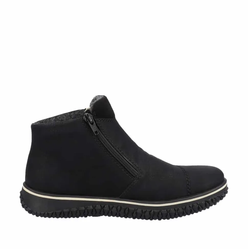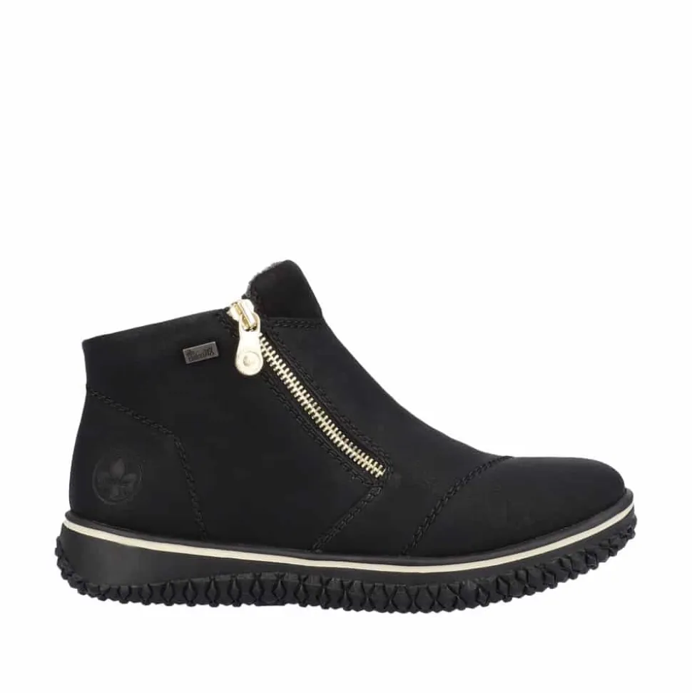 Rieker ankelstøvle i sort til dame. Tag verden med storm i alle slags vejr med denne elegante Rieker støvle! Den sorte støvle er ikke kun et stilfuldt statement, men også en praktisk løsning til den moderne kvinde. Lynlåse på begge sider gør det hurtigt og nemt at hoppe i støvlerne, perfekt til dig, der er på farten. Det luksuriøst bløde, varme foer holder dine fødder dejligt varme hele dagen, mens RiekerTex-teknologien sikrer en imponerende vandafvisende beskyttelse. Uanset om det regner eller sner, er disse støvler dine trofaste følgesvende, der kombinerer komfort, stil og funktionalitet.