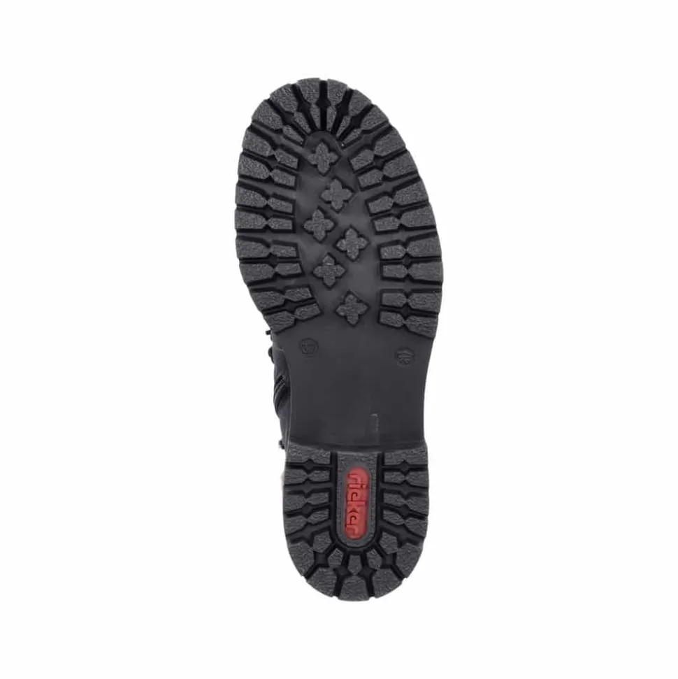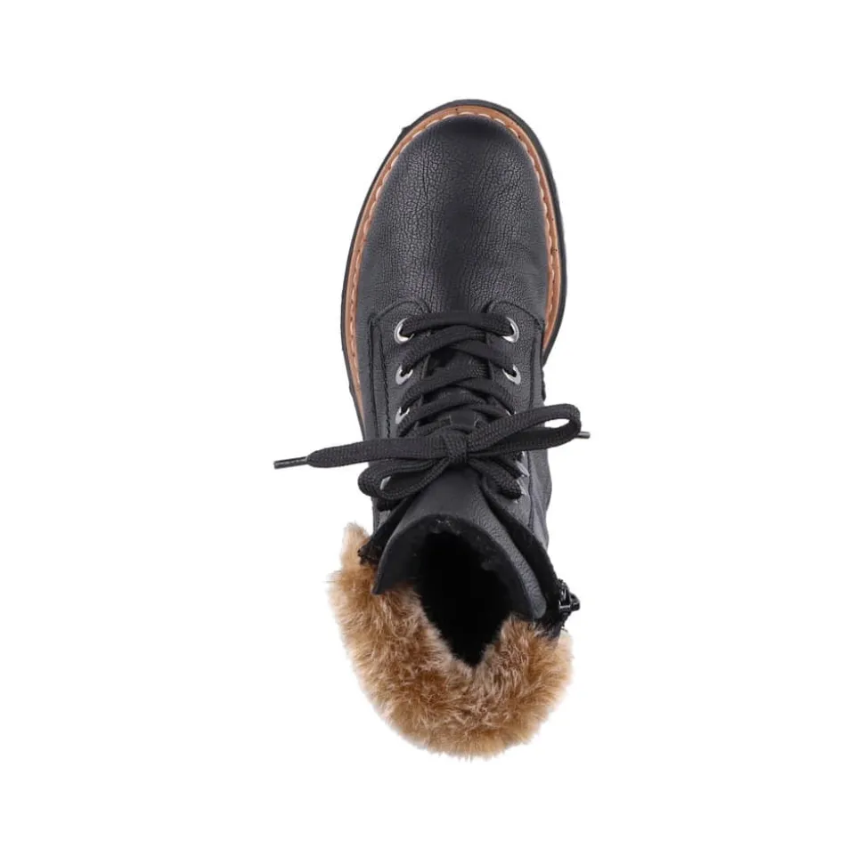 Rieker vinterstøvle til dame i sort. Disse sorte vinterstøvler giver både stil og komfort. De er lavet med en særlig teknik, der gør dem ekstra holdbare og fleksible. Snørebåndene og lynlåsen sikrer en god pasform og støtte. En flot skaftkrave med pels tilføjer et moderne look. Den lette sål og blokhælen giver stødabsorbering ved hvert skridt, mens den bløde indersål gør dem ekstra behagelige. Den varme foring holder dine fødder varme hele dagen, selv i kolde temperaturer.