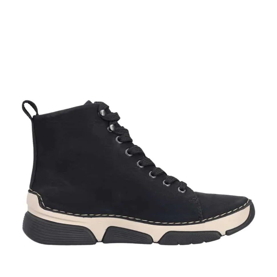 Rieker støvle til dame i sort. Denne støvle er ideel til hverdagen. Den er udstyret med både snørebånd og en funktionel lynlås, som gør det nemt at tage den af og på. Indvendigt finder du en let foring og en blød sål, der giver god komfort hele dagen. Med Rieker Antistress føles støvlen let og fleksibel, mens den mønstrede ydersål giver øget stødabsorbering og skridsikkerhed.