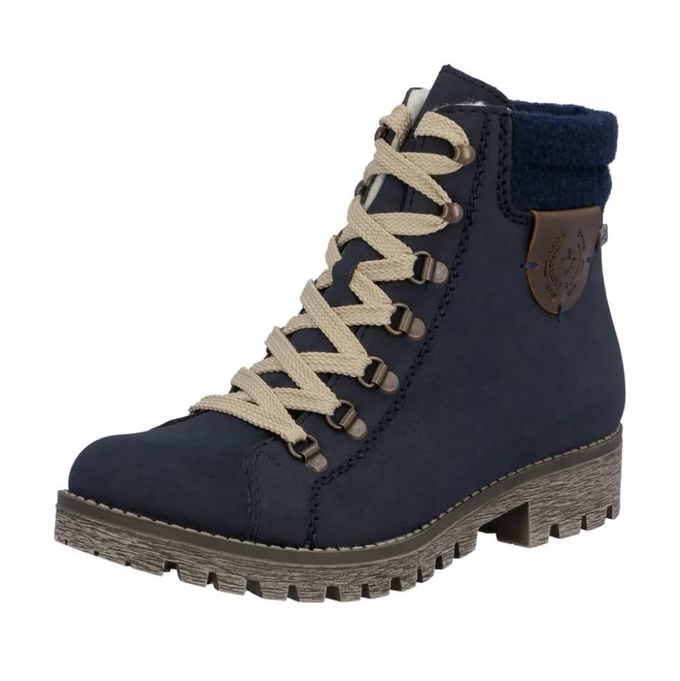 Rieker støvle til dame i blå. Populær vinterstøvle i mørkeblå med enkle detaljer, der giver et elegant og stilfuldt look. Støvlen er designet med snørebånd foran, så pasformen kan justeres, og en praktisk lynlås på siden, der gør den nem at tage på. Indvendigt sørger en varm foring for, at fødderne holdes lune, mens Rieker-Tex giver en kraftig vandafvisning. Den solide ydersål med mønster og stødabsorbering giver både støtte og øget skridsikkerhed på glatte underlag.