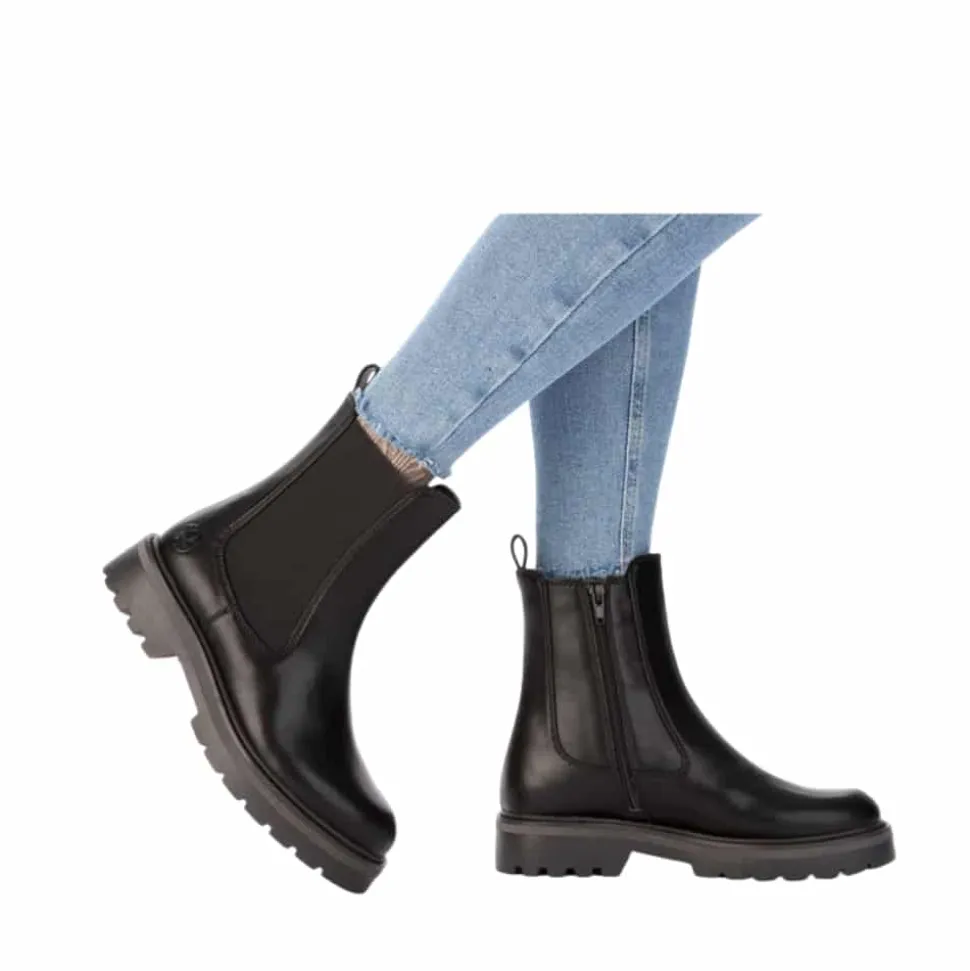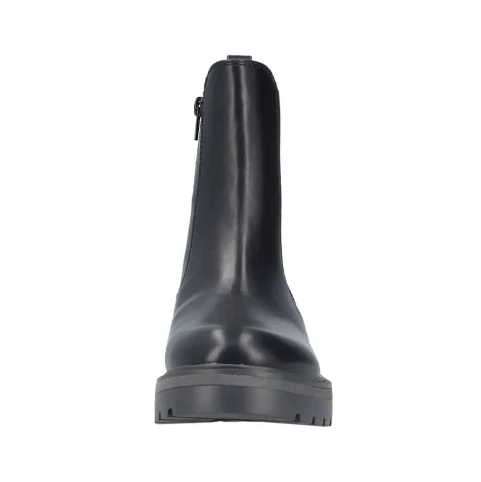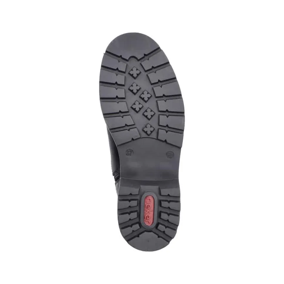 Rieker støvle til dame i sort. Smart vinterstøvle i sort med klassiske detaljer, der giver et stilfuldt look. Støvlen har en funktionel lynlås på indersiden, som gør den nem at tage af og på, samt en elastik på ydersiden, der sikrer en god og fleksibel pasform. Indvendigt finder du en varm foring og en blød indersål, som giver optimal komfort dagen igennem. Den chunky ydersål med mønster og stødabsorbering giver god støtte og øget skridsikkerhed.