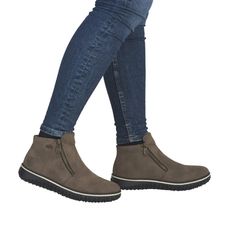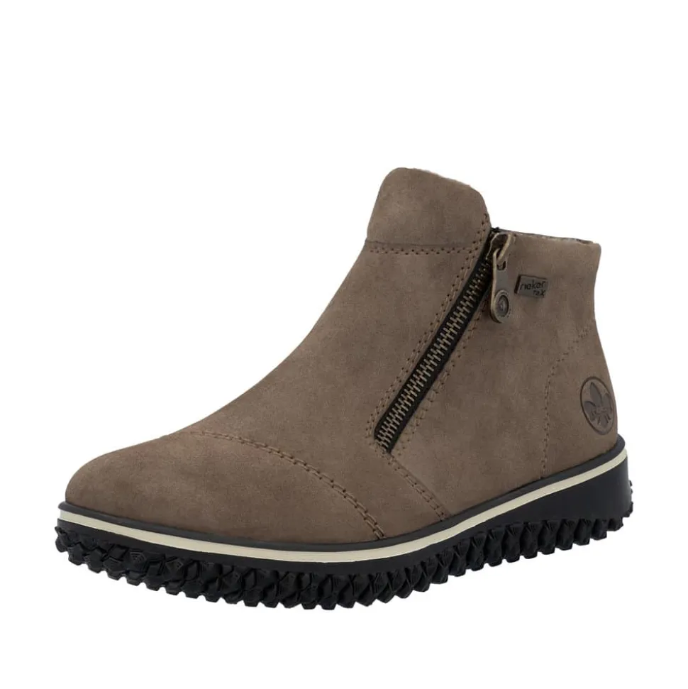 Rieker støvle til dame i brun. Denne støvle er perfekt til hverdagen og kombinerer praktiske detaljer med høj komfort. Modellen har to funktionelle lynlåse, der gør modellen nem at tage af og på. Indvendigt finder du en blød indersål og en varm foring, som giver behagelig komfort hele dagen. Rieker-Tex gør støvlen kraftigt vandafvisende, mens den mønstrede ydersål øger både stødabsorbering og skridsikkerhed.