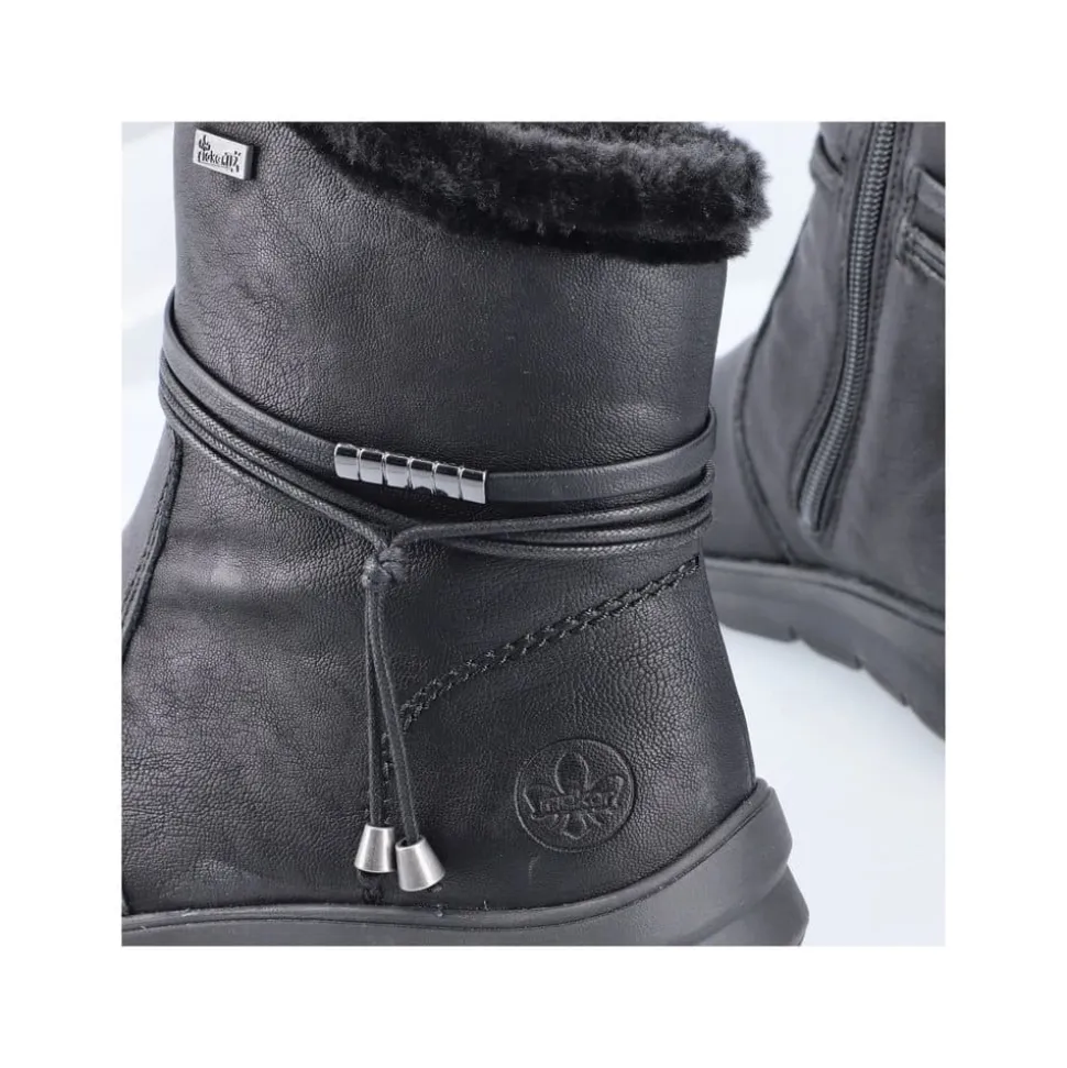 Rieker støvle til dame i sort. Stil og komfort mødes i disse sorte ankelstøvler til kvinder. Lynlåsen gør det nemt og hurtigt at tage støvlerne af og på, mens den pelsbeklædte kant giver et elegant touch. Indvendigt finder du en blød og udtagelig indersål samt en varm foring, der holder fødderne behageligt lune. Med Rieker Tex får du kraftig vandafvisning, og den stødabsorberende ydersål med et godt mønster giver øget støtte og skridsikkerhed.