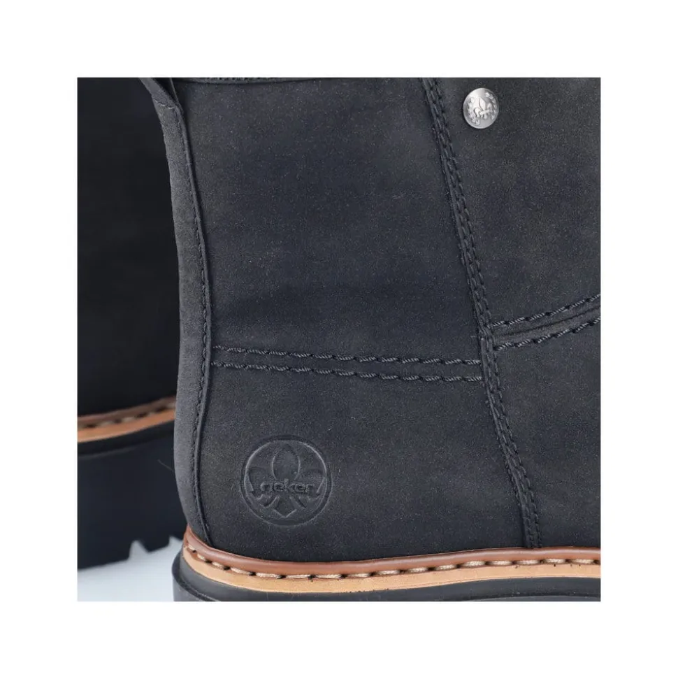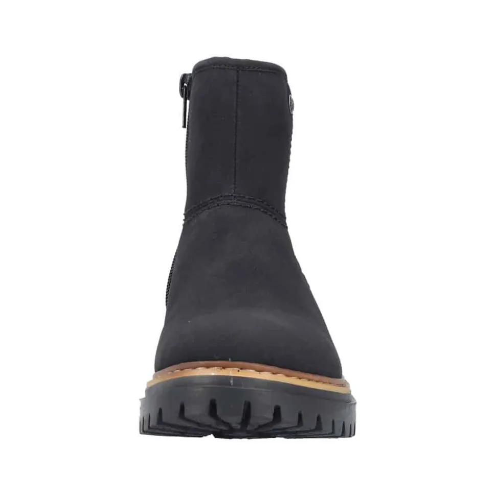 Rieker støvle til dame i sort. Populær ankelstøvle i klassisk sort med et enkelt design, der giver et elegant strejf af stil. Den funktionelle lynlås på indersiden gør det nemt at tage støvlen af og på. Indvendigt finder du en blød indersål og en varm foring, som holder fødderne behageligt lune. Den chunky ydersål på cirka 4 cm har stødabsorberende egenskaber, der giver ekstra støtte, mens det mønstrede design øger skridsikkerheden.