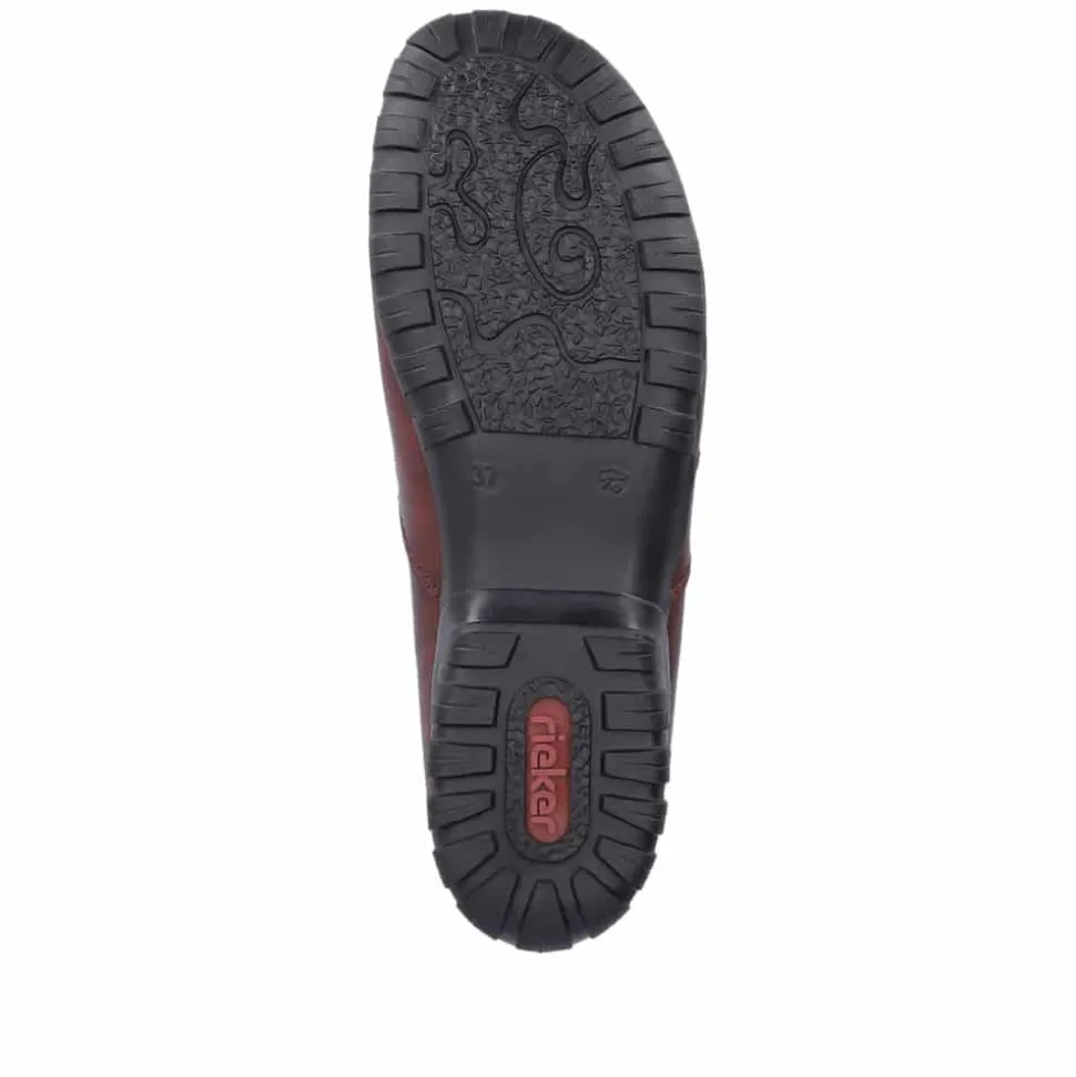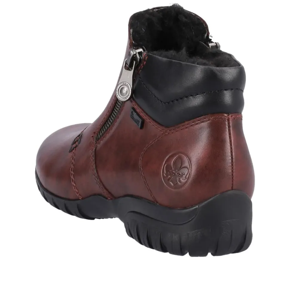 Rieker støvle til dame i bordeaux. Flot støvle i bordeaux skind med fine detaljer, der giver et stilfuldt udtryk. Modellen har to funktionelle lynlåse, som gør den nem at tage af og på. Indvendigt finder du en varm foring samt en blød udtagelig sål, der giver høj komfort hele dagen. Mens Rieker-Tex gør støvlen kraftig vandafvisende, og den mønstrede ydersål øger både stødabsorbering og skridsikkerhed.