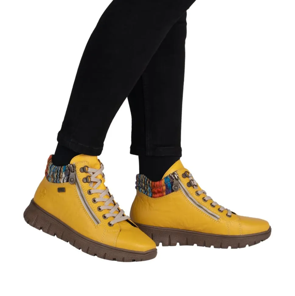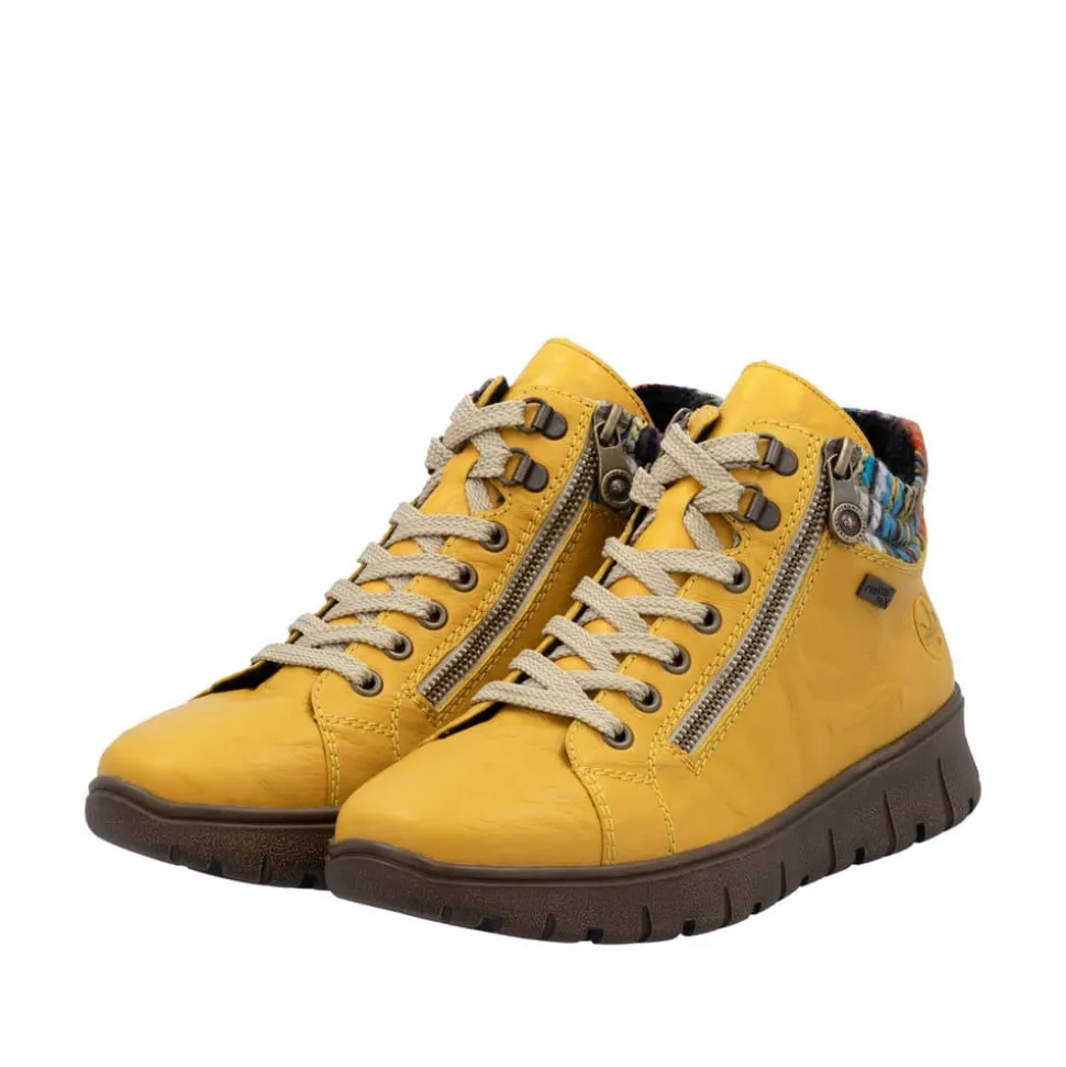 Rieker støvle til dame i gul. Flot støvle i skind, designet med fokus på både udseende og komfort. Støvlen har snørebånd og to funktionelle lynlåse, som gør det hurtigt og nemt at komme i og af. Indvendigt sørger en blød udtagelig sål og en varm foring for, at fødderne har det behageligt hele dagen. Rieker-Tex beskytter gør støvlen kraftig vandafvisende, og den mønstrede ydersål giver øget stødabsorbering og skridsikkerhed.