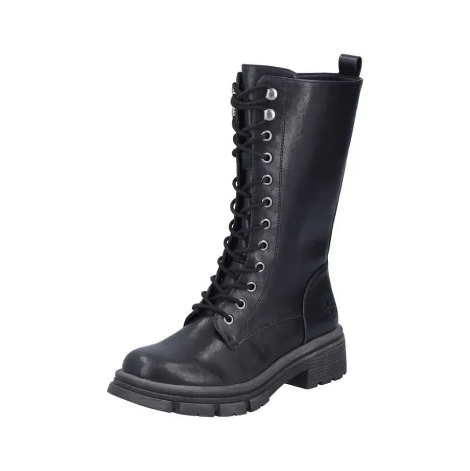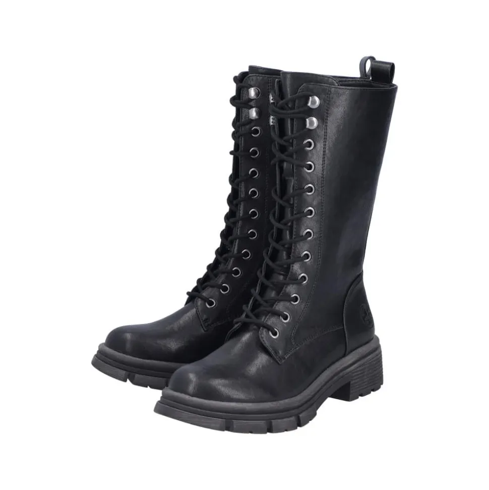 Rieker støvle til dame i sort. Flot støvle i klassisk sort, der kombinerer stil med praktiske funktioner. Modellen er udstyret med snørebånd og en funktionel lynlås, som gør den nem at tage af og på. Indvendigt giver en varm foring og en blød sål for høj komfort gennem hele dagen. Den chunky ydersål fuldender designet og giver både øget stødabsorbering og skridsikkerhed.