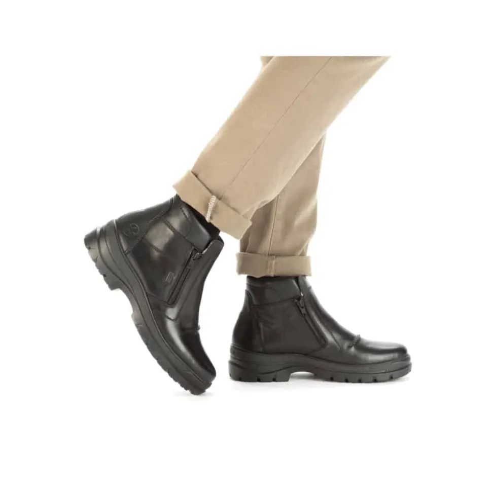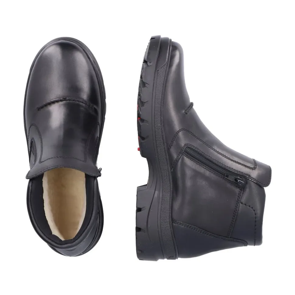Rieker støvle til herre i sort. Smart herrestøvle i sort med moderne detaljer, der giver et stilfuldt udtryk. Støvlen er fremstillet med en skindoverdel og har to funktionelle lynlåse, som gør den nem at tage af og på. Indvendigt finder du en blød og udtagelig termosål, der sikrer god komfort, mens den varme foring holder fødderne lune. Støvlen er rummelig med ekstra bredde G og udstyret med Rieker-Tex, som gør den kraftigt vandafvisende. Den chunky ydersål har stødabsorbering og foldbare pigge, som giver øget skridsikkerhed og støtte.