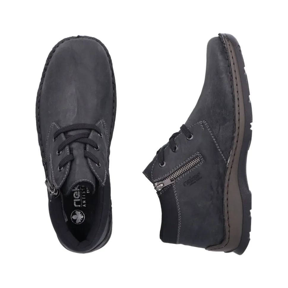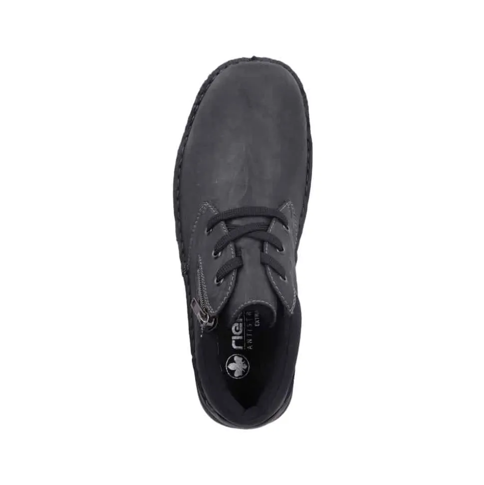 Rieker støvle til herre i grå. Flot og klassisk herrestøvle i sort med et tidløst design. Støvlen har snørebånd og en lille lynlås i siden, som gør det nemt at tage støvlen af og på. Indvendigt finder du en blød sål og en varm foring, der giver komfort hele dagen, mens den ekstra bredde (H) sikrer en rummelig pasform. Ydersålen med mønster giver øget stødabsorbering og skridsikkerhed.