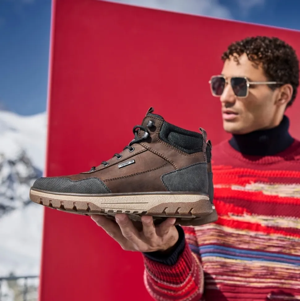 Rieker støvle til herre i mørkebrun. Med denne støvle i skind får du en kombination af moderne design og høj komfort. Snørebåndene foran giver mulighed for at justere pasformen, mens lynlåsen på indersiden gør det nemt at tage støvlen på. Indvendigt sørger en varm foring og en blød udtagelig sål for komfort hele dagen, og den ekstra bredde (H) giver foden mere plads og fleksibilitet. Støvlen er desuden udstyret med Rieker-Tex som gør støvlen kraftig vandafvisende, mens den mønstrede ydersål giver øget stødabsorbering og skridsikkerhed.