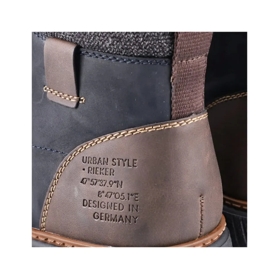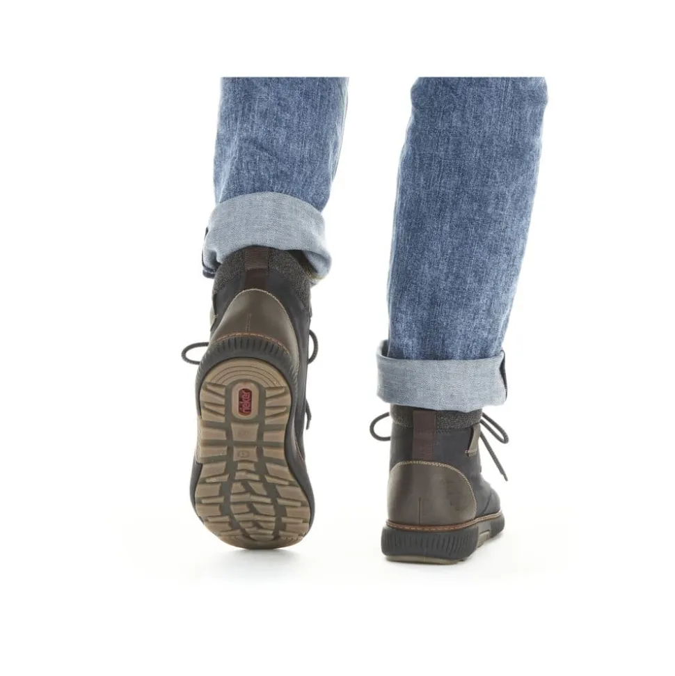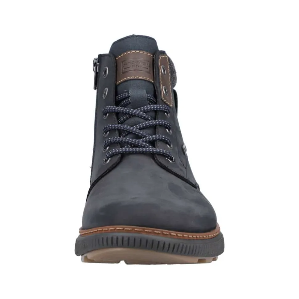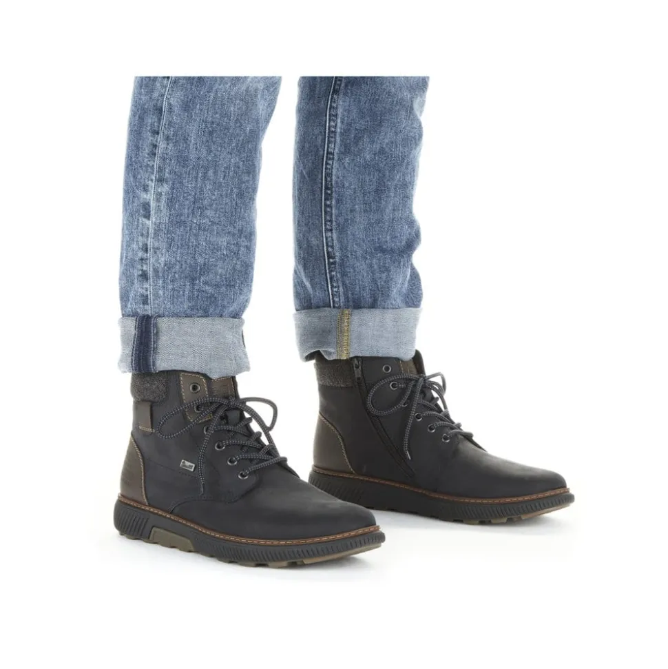 Rieker støvle til herre i mørkeblå. Disse mørkeblå snørestøvler i ruskind fra Rieker har den perfekte kombination mellem komfort og stil. Kombinationen af snørebånd og lynlås giver en god pasform og støtte. Den lette sål sikrer alsidig ydeevne, mens den bløde, udtagelige indersål øger komforten. Støvlen har en ekstra bred H-pasform, som giver mere plads til fødderne. Med RiekerTEX, der holder vand ude, og den varme uld foring, forbliver dine fødder både varme og tørre uanset vejret.