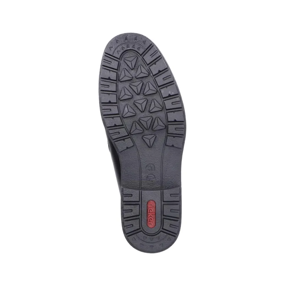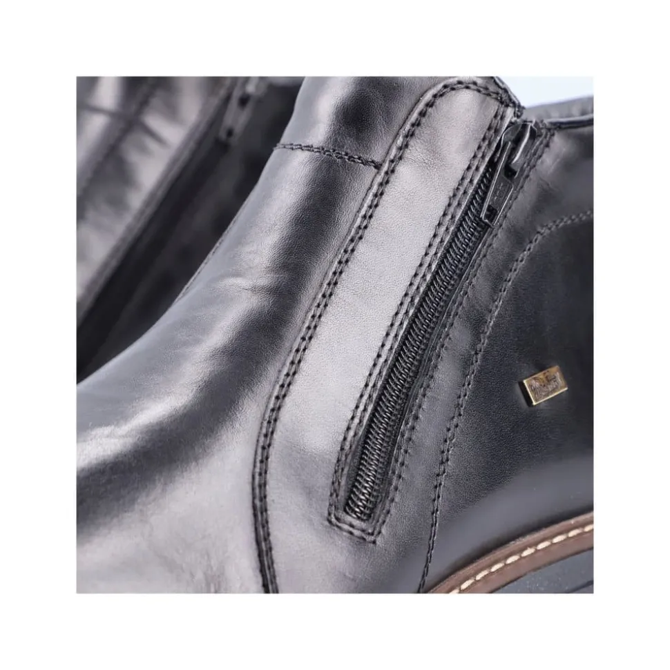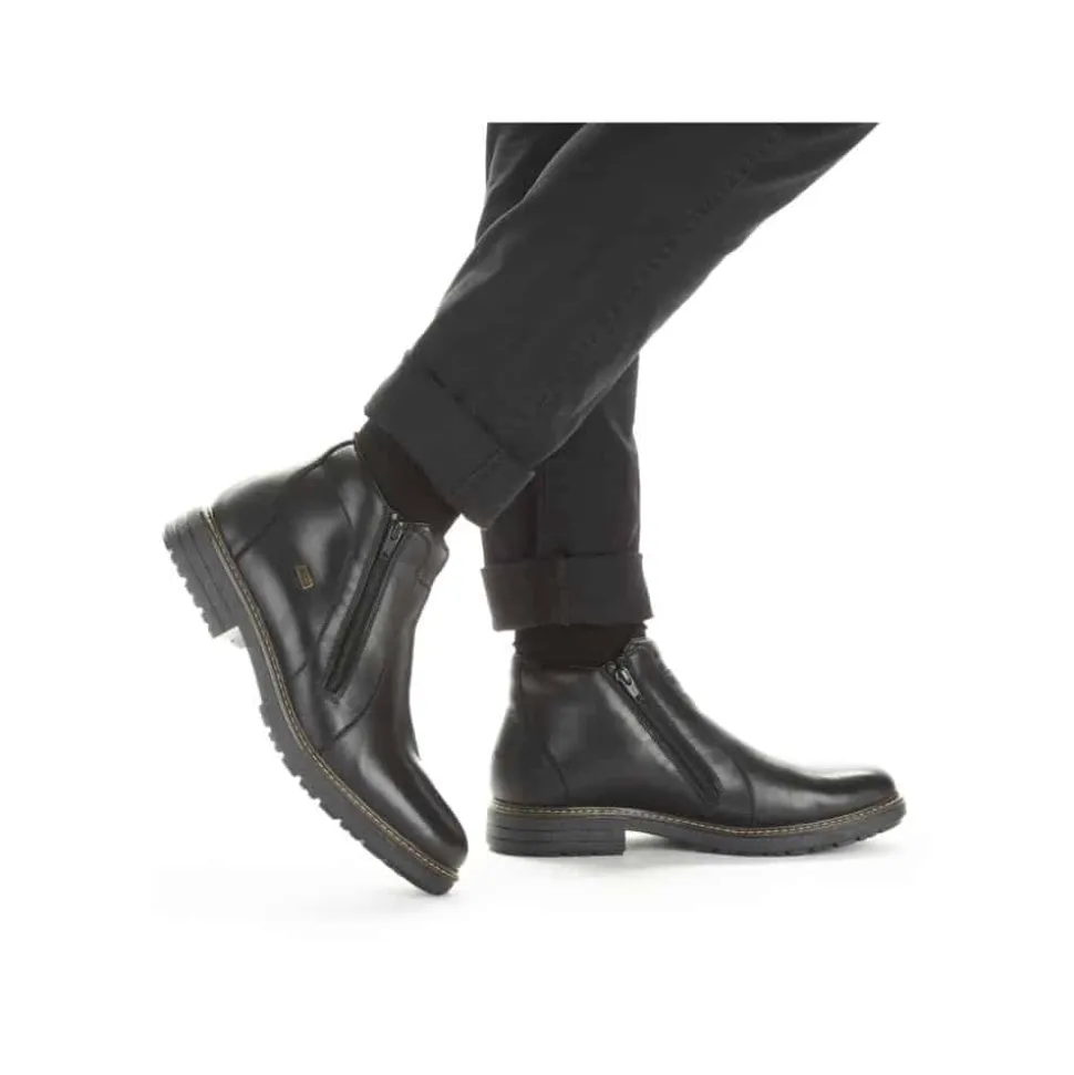 Rieker støvle til herre i sort. Forkæl dig selv med Rieker’s sorte herrestøvler, hvor stil og komfort går op i en højere enhed. Støvlerne har lynlåslukning på begge sider, så de er nemme at tage af og på. Den 3.5 cm høje hæl giver dig en elegant løft, uden at gå på kompromis med komforten. Lavet med en overdel førsteklasses skind og med en varm tekstilforing, holder de dine fødder behageligt varme hele dagen. Med RiekerTex-membranen er dine fødder beskyttet mod vind og vejr som gør støvlen vandafvisende, mens den slidstærke TPE/gummisål sikrer et fast greb på alle underlag. Disse støvler er det ideelle valg for den stilbevidste mand, der sætter pris på kvalitet og design.