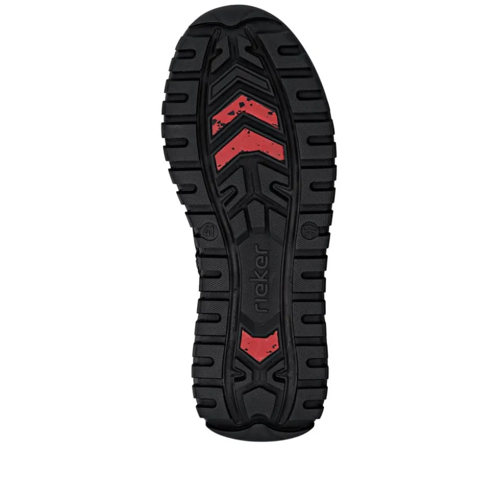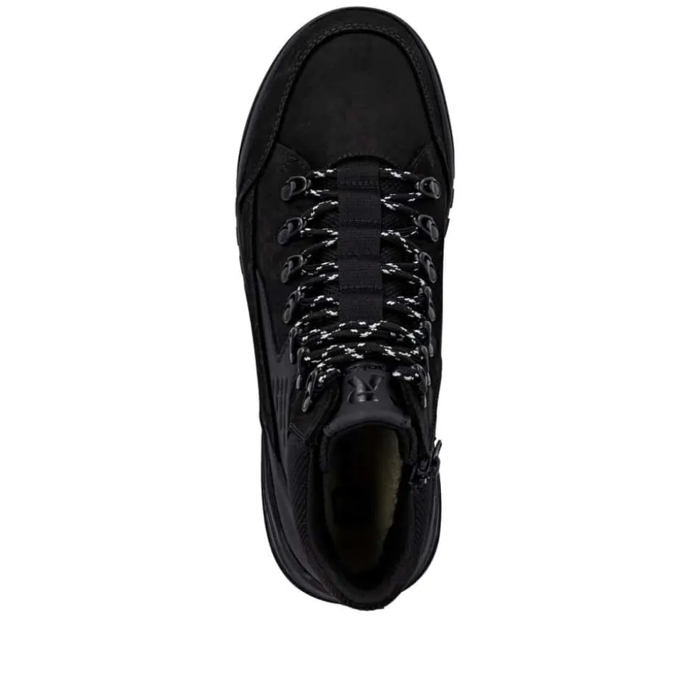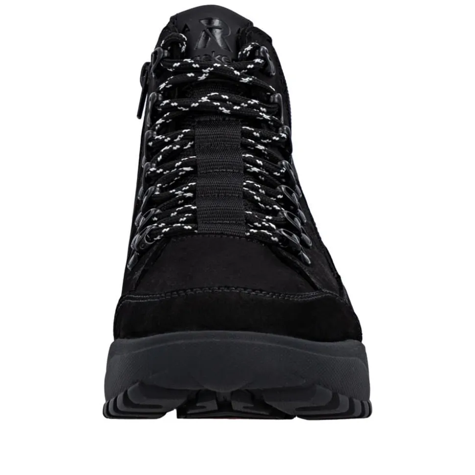 Rieker støvle til herre i sort. Denne støvle kombinerer design og komfort på bedste vis. Den har snørebånd og en funktionel lynlås, så du nemt kan tilpasse pasformen til din fod. Indvendigt finder du en blød Rieker-soft sål og en varm foring, der sikrer behagelig komfort hele dagen. Den ekstra bredde (G) giver mere rummelighed, mens Rieker-Tex gør støvlen kraftigt vandafvisende. Ydersålen med mønster giver øget stødabsorbering og god skridsikkerhed.