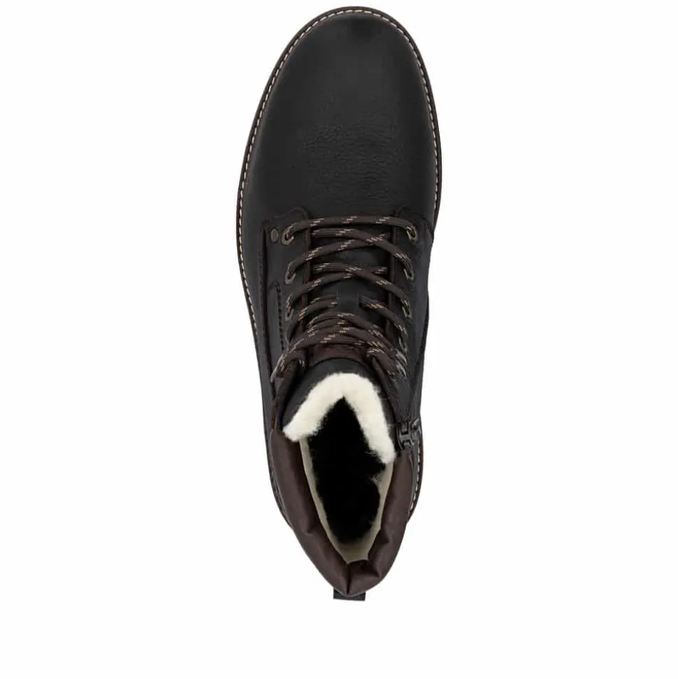 Rieker støvle til herre i mørkebrun. En flot mørkebrun vinterstøvle i skind med praktiske og stilfulde detaljer. Snørebåndene foran giver mulighed for at justere pasformen, og lynlåsen på indersiden gør støvlen let at tage på. Indvendigt finder du en varm uldforing og en blød indersål med ekstra bredde G, som sikrer komfort og rummelighed. Rieker-Tex gør støvlen kraftigt vandafvisende, mens den slidstærke ydersål med stødabsorbering og mønster giver øget skridsikkerhed og støtte på vinterens underlag.