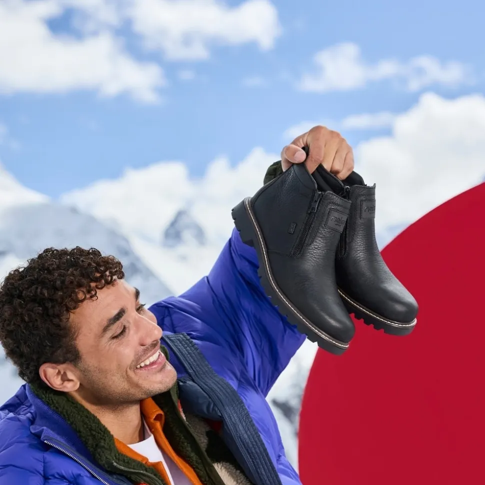 Rieker støvle til herre i sort. Moderne vinterstøvle i sort med klassiske detaljer og en skindoverdel, der giver et stilrent udtryk. Støvlen er udstyret med to funktionelle lynlåse, som gør den nem at tage af og på. Indvendigt sørger en blød indersål og en varm foring for høj komfort og lune fødder i den kolde tid. Pasformen er rummelig med ekstra bredde G, og Rieker-Tex giver kraftig vandafvisning. Med en solid Fiber-Grip ydersål der er udstyret med stødabsorbering og et godt mønster, får du øget skridsikkerhed og støtte.