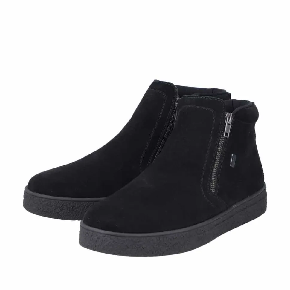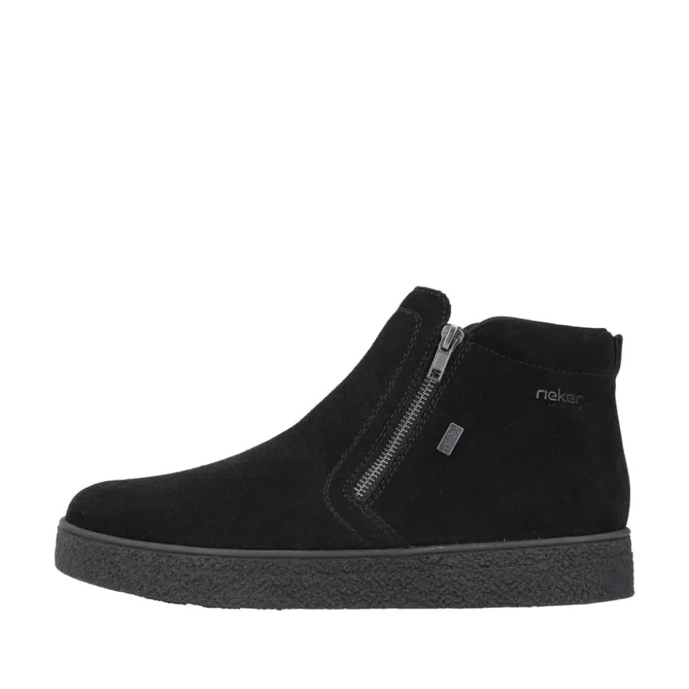 Rieker støvle til herre i sort. Disse sorte herrestøvler i ruskind har den perfekte kombination af komfort, funktion og stil. En praktisk lynlås på indersiden gør dem lette at tage af og på, mens den lette og stødabsorberende sål, sikrer komfort og stabilitet ved hvert skridt. Den bløde indersål og rummelige pasform med en bredde på H, sikrer optimal komfort dagen lang. Fødderne holdes varme takket være det bløde og varme uldforing, og Rieker-Tex giver kraftig vandafvisning.