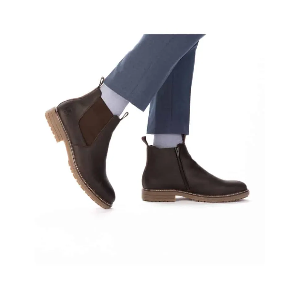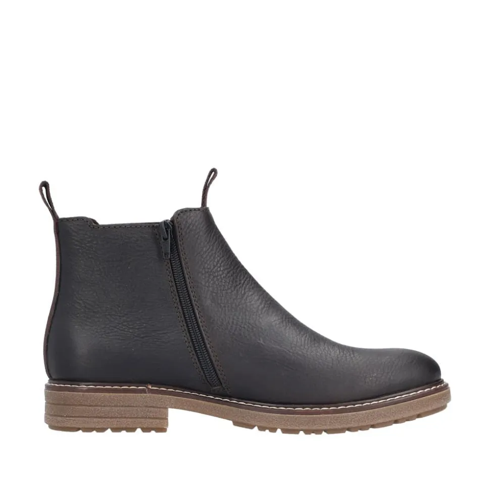 Rieker støvle til herre i mørkebrun. Flot støvle i skind, der kombinerer komfort med et klassisk look. Modellen er designet med lynlås på indersiden og elastik på ydersiden, så støvlen er nem at få af og på. Indvendigt er modellen udstyret med en blød sål og en let foring samt ekstra bredde (G), som giver foden rummelighed og fleksibilitet. Ydersålen har et godt mønster der øger stødabsorbering og skridsikkerhed.