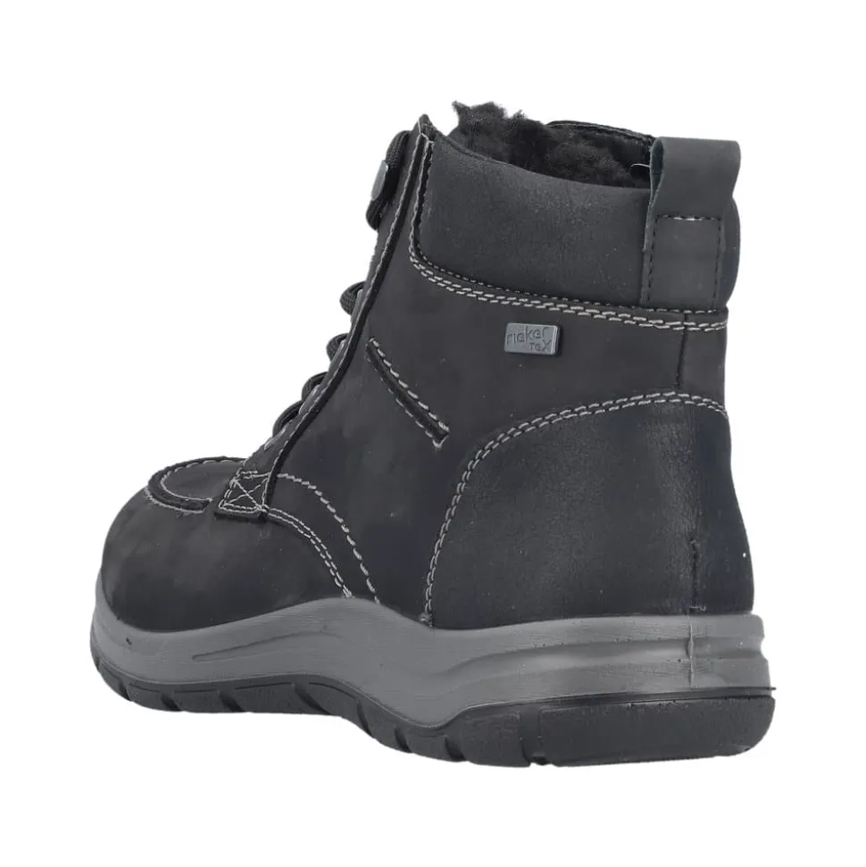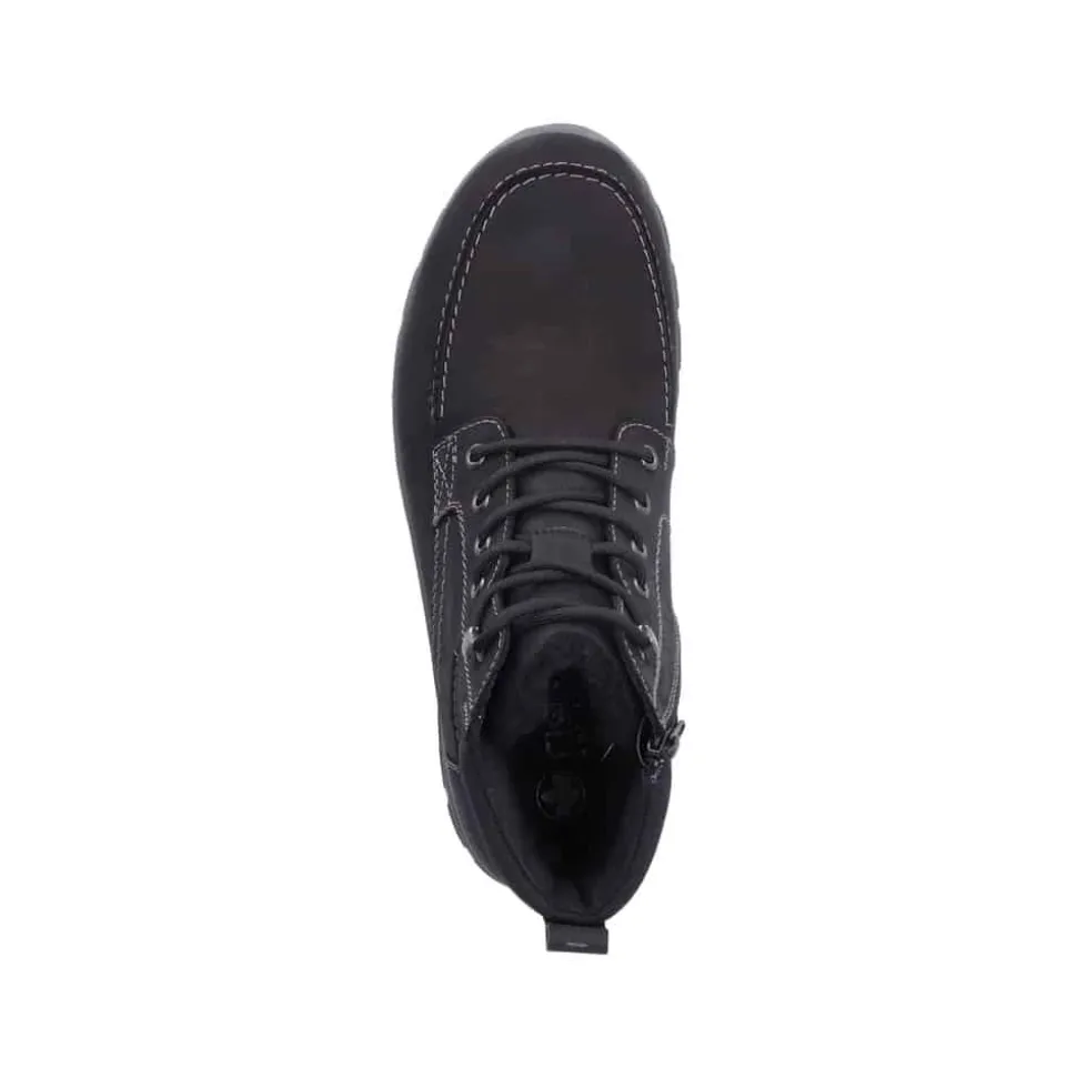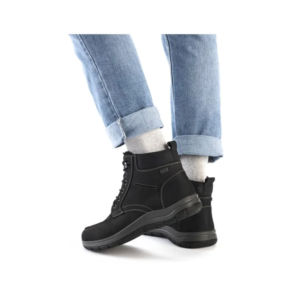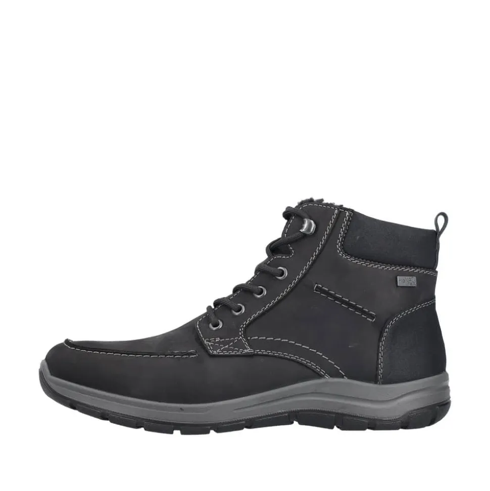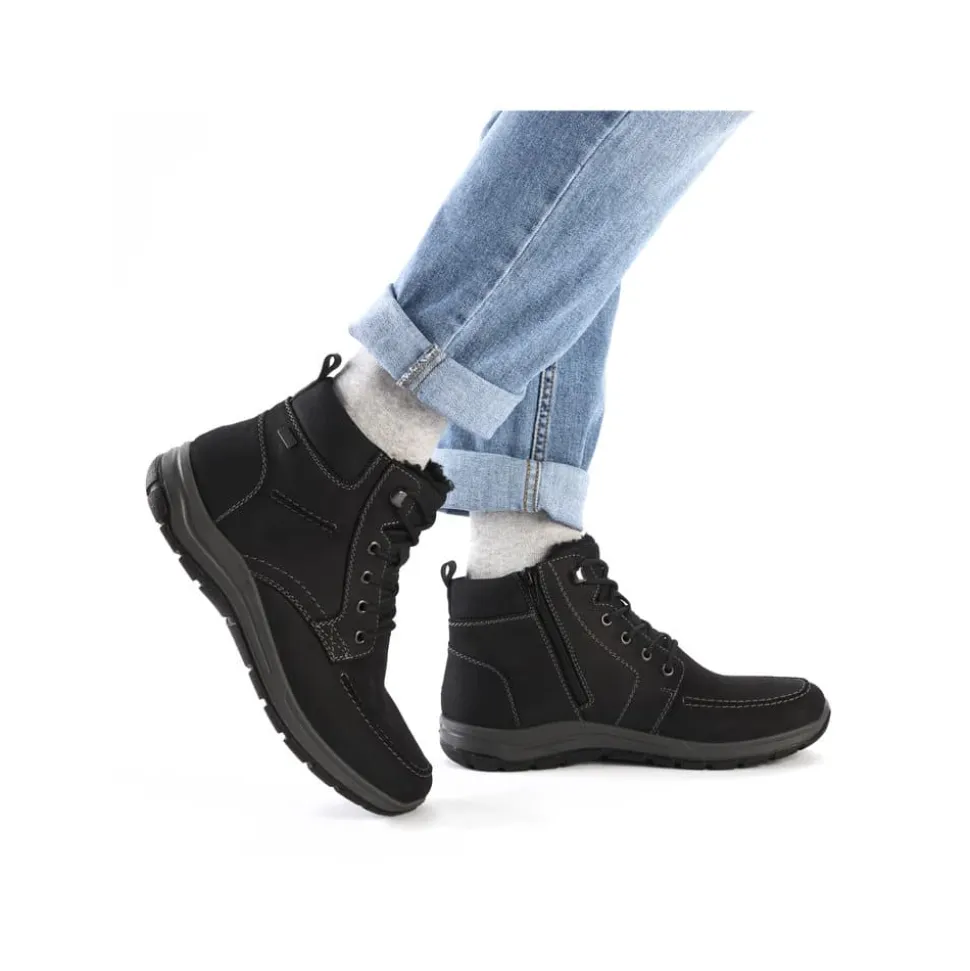 Rieker vinterstøvle til herre i sort. Snørestøvler til herrer fremstillet med en overdel i ægte ruskind. Støvlerne byder på et klassisk design kombineret med fremragende komfort. Den praktiske kombination af snørebånd og lynlås sikrer en perfekt pasform og gør det nemt at tage støvlerne af og på. Den lette og stødabsorberende sål giver dine fødder maksimal komfort hele dagen. Med en polstret og udtagelig indersål føles hvert skridt som ren forkælelse. Den ekstra brede pasform (H) giver rigelig plads til tæerne, mens den vandafvisende RiekerTEX-membran beskytter mod vind og vejr. Det bløde, varme foer holder fødderne behageligt lune, selv på kolde vinterdage. Perfekt til at kombinere funktionalitet og elegance i vinterens udfordringer.