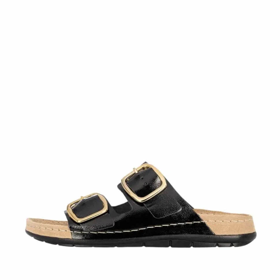 Rohde Easys N°42 sandal til dame i sort lakfarve. Dyk ned i komforten med denne klassiske og lette sandal fra Rohde. Med to justerbare spænder kan du skræddersy pasformen til din fod perfekt. Denne model er omhyggeligt fremstillet af kvalitetsskind både udvendigt og indvendigt, hvilket tilføjer en ekstra dimension af luksus og holdbarhed. Den indbyggede Memory stødabsorberende sål sikrer, at hvert skridt føles blødt og behageligt, hvilket gør den ideel til lange gåture og aktiviteter hele dagen. Memory-fodsengen har et let Memory-gelindlæg, der støtter den naturlige bevægelse, fordeler trykket og giver ekstra komfort og støtte til foden.