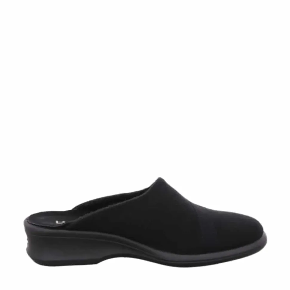 Rohde hjemmesko til dame i sort. Disse hjemmesko er både lette og moderne i en elegant sort farve med fine detaljer. De er fremstillet af blødt materiale og har en ekstra pude ved hælen, der sikrer maksimal komfort. Den solide sål gør dem perfekte til dagligdags brug derhjemme. En hjemmesko, der tilbyder en fantastisk pasform og høj komfort!